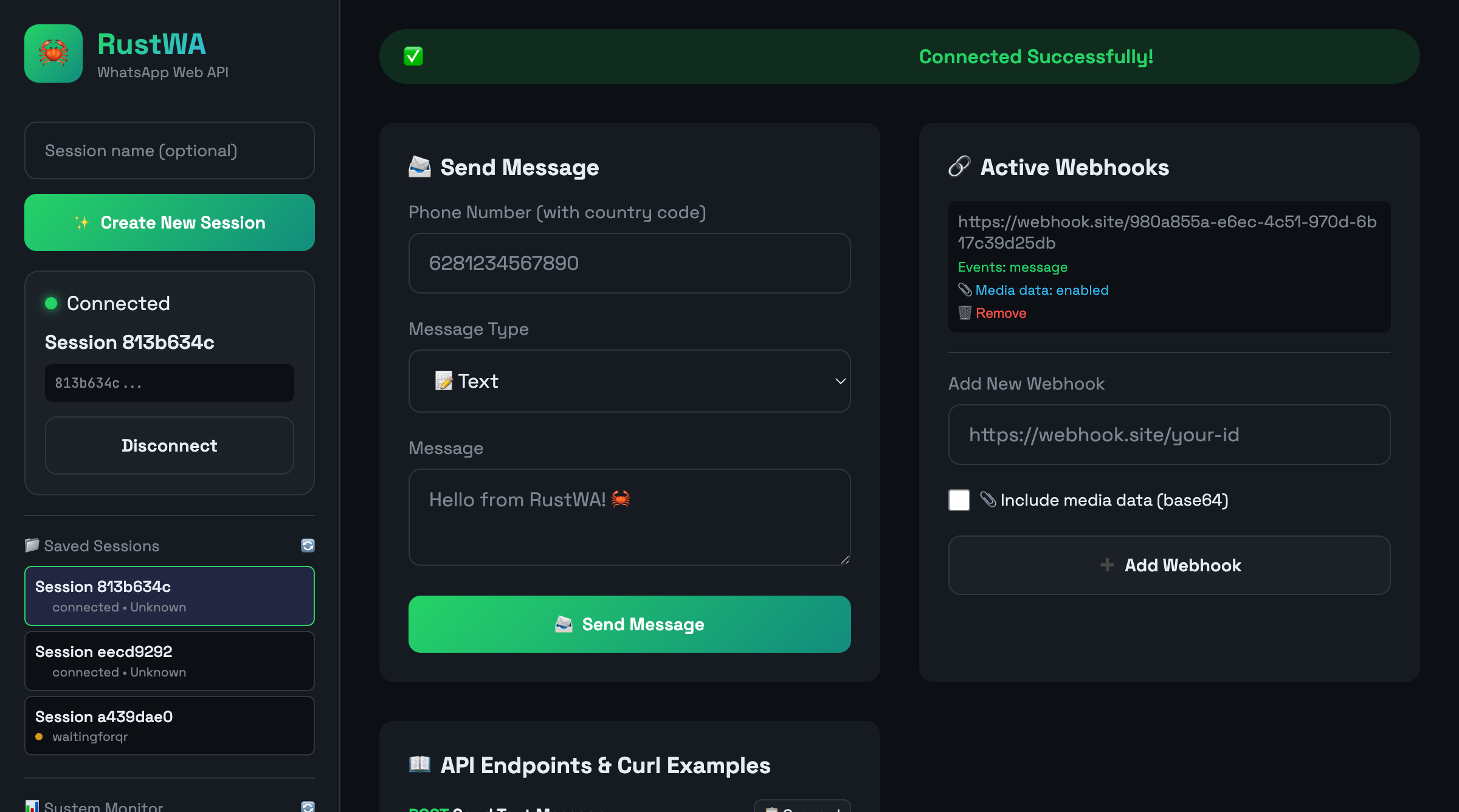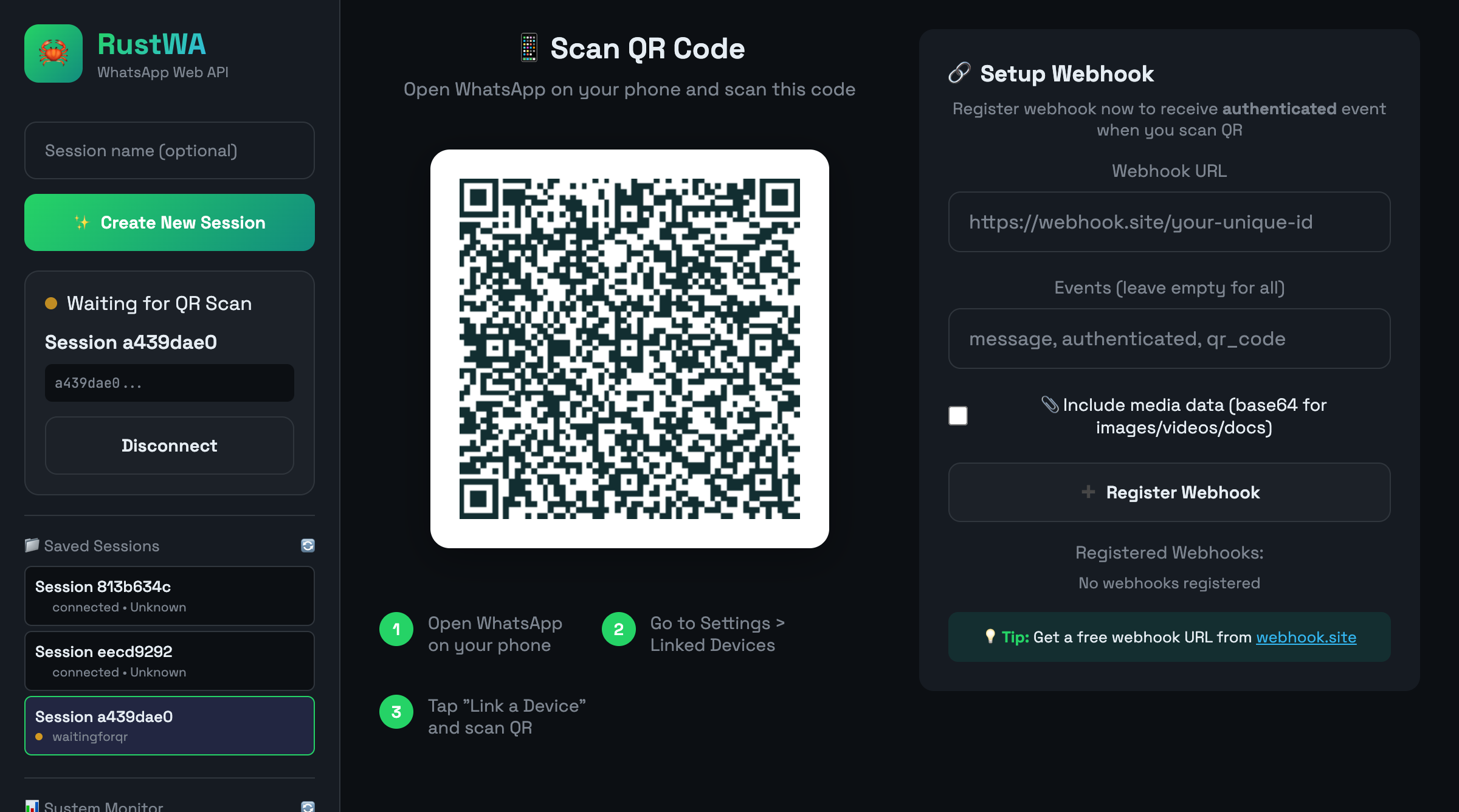 「RustWA」は、Rustで構築されたWhatsApp Web APIで、シンプルなREST APIを通じてメッセージの送受信が可能です。ユーザーは、テキストやメディアの送信、Webhookを通じたメッセージ受信、マルチセッション対応、QRコードによるログイン、Webダッシュボードなど、必要な機能を備えていますが、複雑なグループ管理やステータス機能などは省かれています。