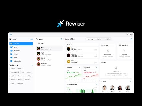 「Rewiser」は、ユーザーの金銭管理のスタイルに合わせてカスタマイズ可能な柔軟な個人財務アプリです。ウェブ、iOS、Apple Watch、Chrome、Raycastに対応し、手動での追跡やZapier、Stripeなどのプラグインとの連携が可能で、自分に合ったシステムを構築できます。
