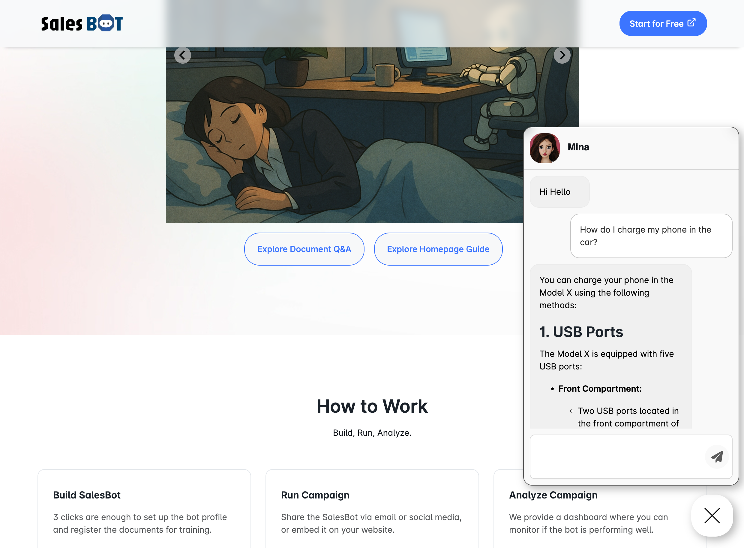 「SalesBot」は、AIチャットボットを活用して24時間営業をサポートし、顧客の質問に即座に応えることで、ビジネスの効率を向上させるプロダクトです。