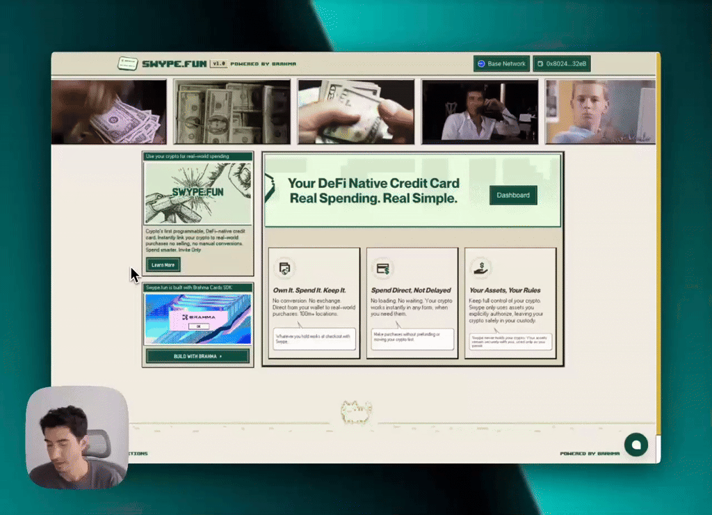 Swype.funは、ユーザーが暗号資産を売却せずにリアルワールドで利用できる初のDeFiネイティブのクレジットカードです。Brahmaのインフラを利用し、AAVEやEulerなどのプロトコルと連携して、購入時に即座にUSDCを借りることができます。これにより、資産はウォレット内で運用され続け、ユーザーは自分の支出ポリシーを設定できる非カストディアルな仕組みが実現されています。
