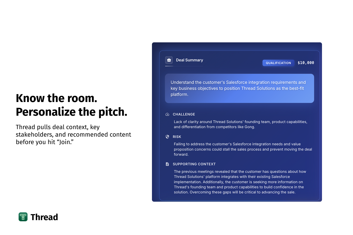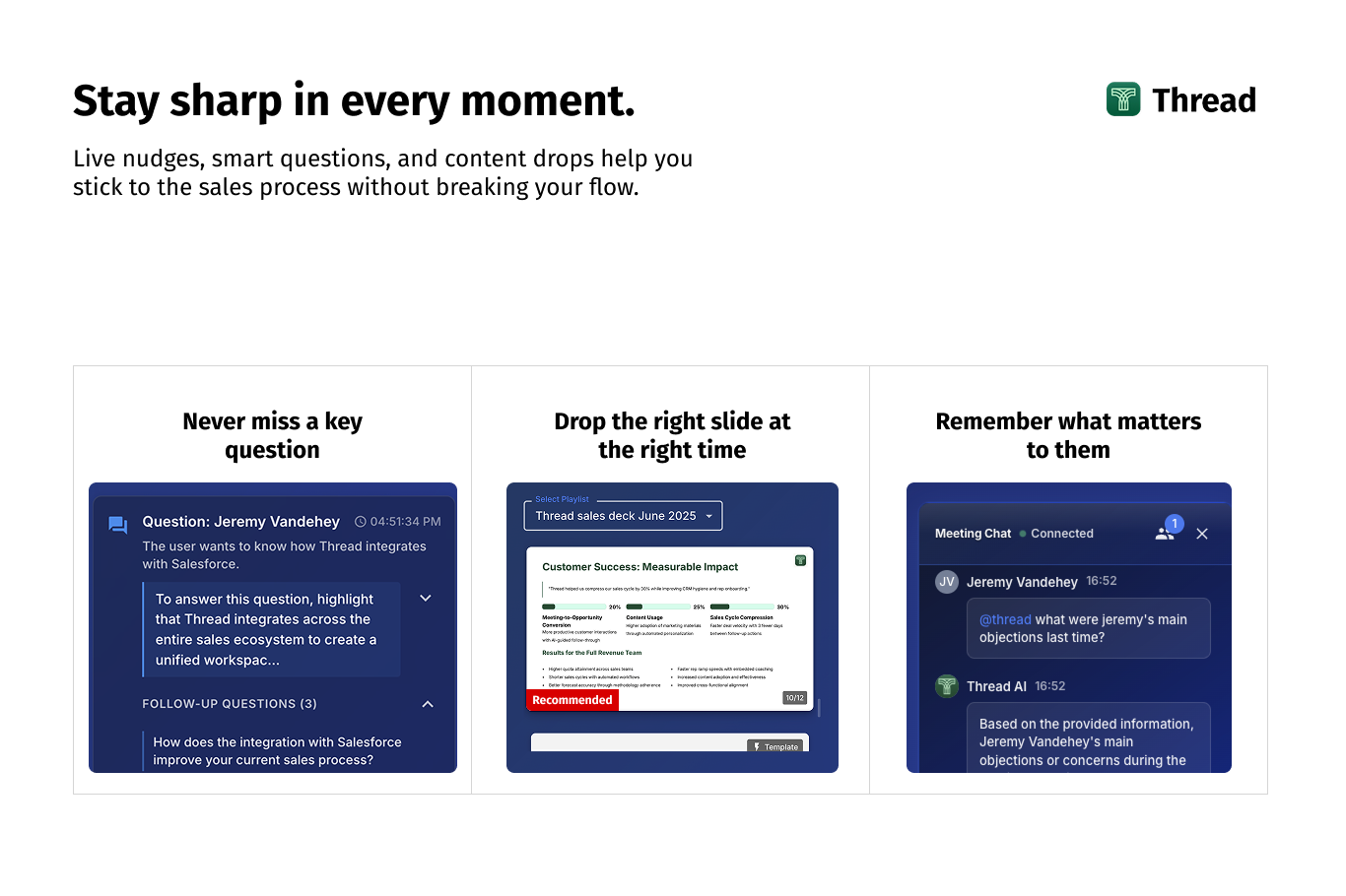 「Thread」は、現代の営業担当者にとって必要なリアルタイムの営業実行プラットフォームで、通話中に実用的な情報を提供し、業務の効率化を図るツールです。