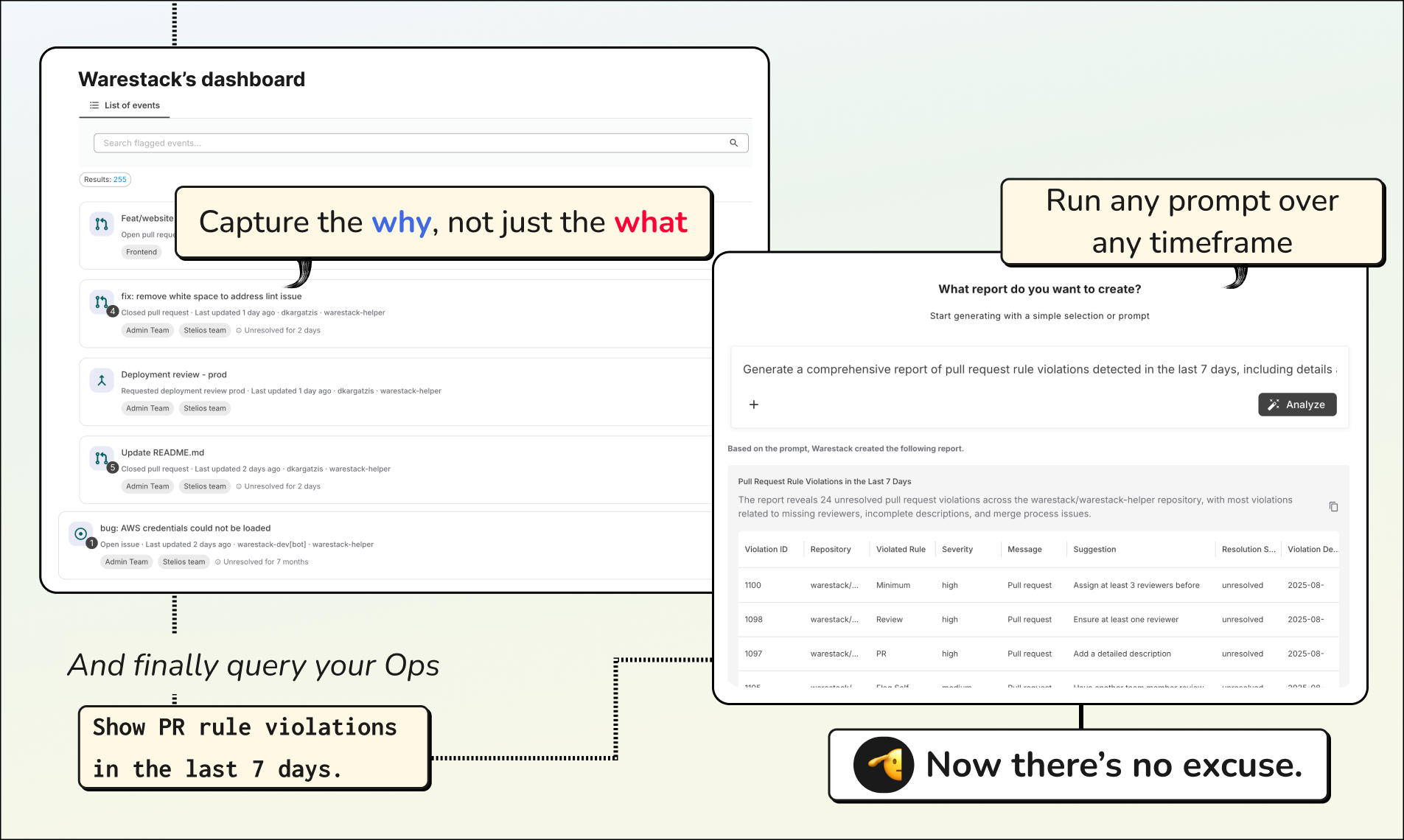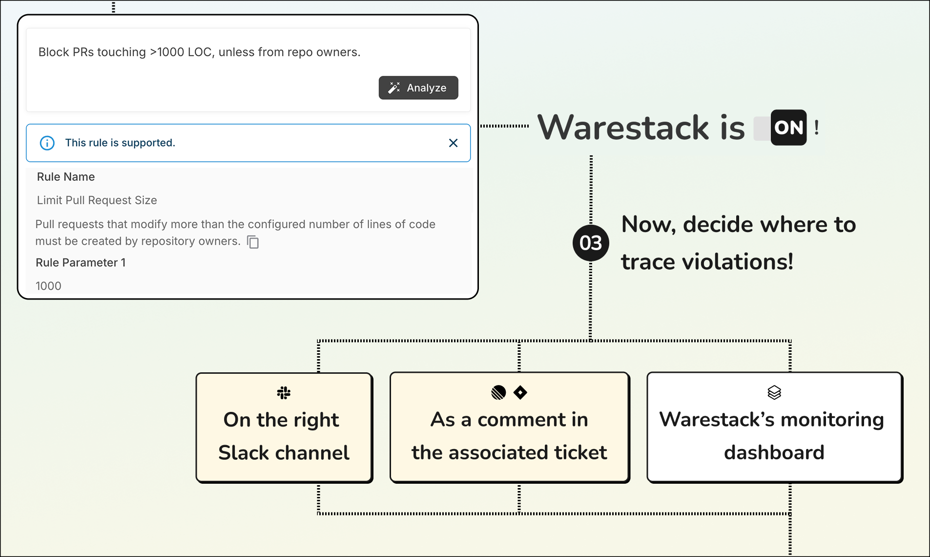 「Warestack」は、DevOpsチームやエンジニアリングマネージャー向けに、リリースを安全に保つためのルールを平易な英語で設定できるツールです。ユーザーからは、既存のツールとの統合がスムーズで、コードに手を加えずに効率的に運用できる点が高く評価されています。また、ルールの動的な適応や、リアルタイムでの通知機能が特に好評です。