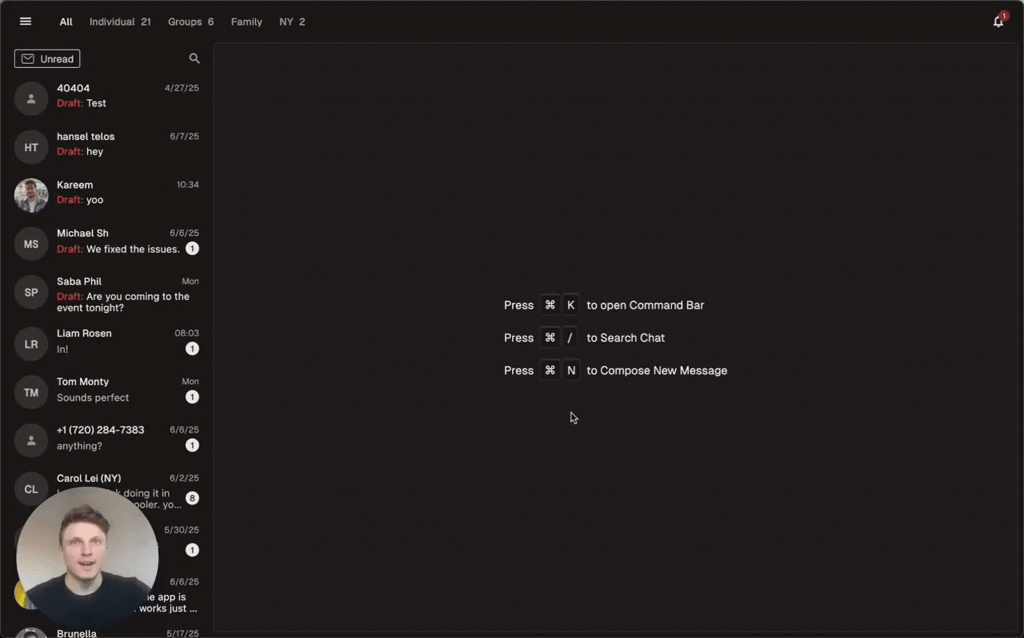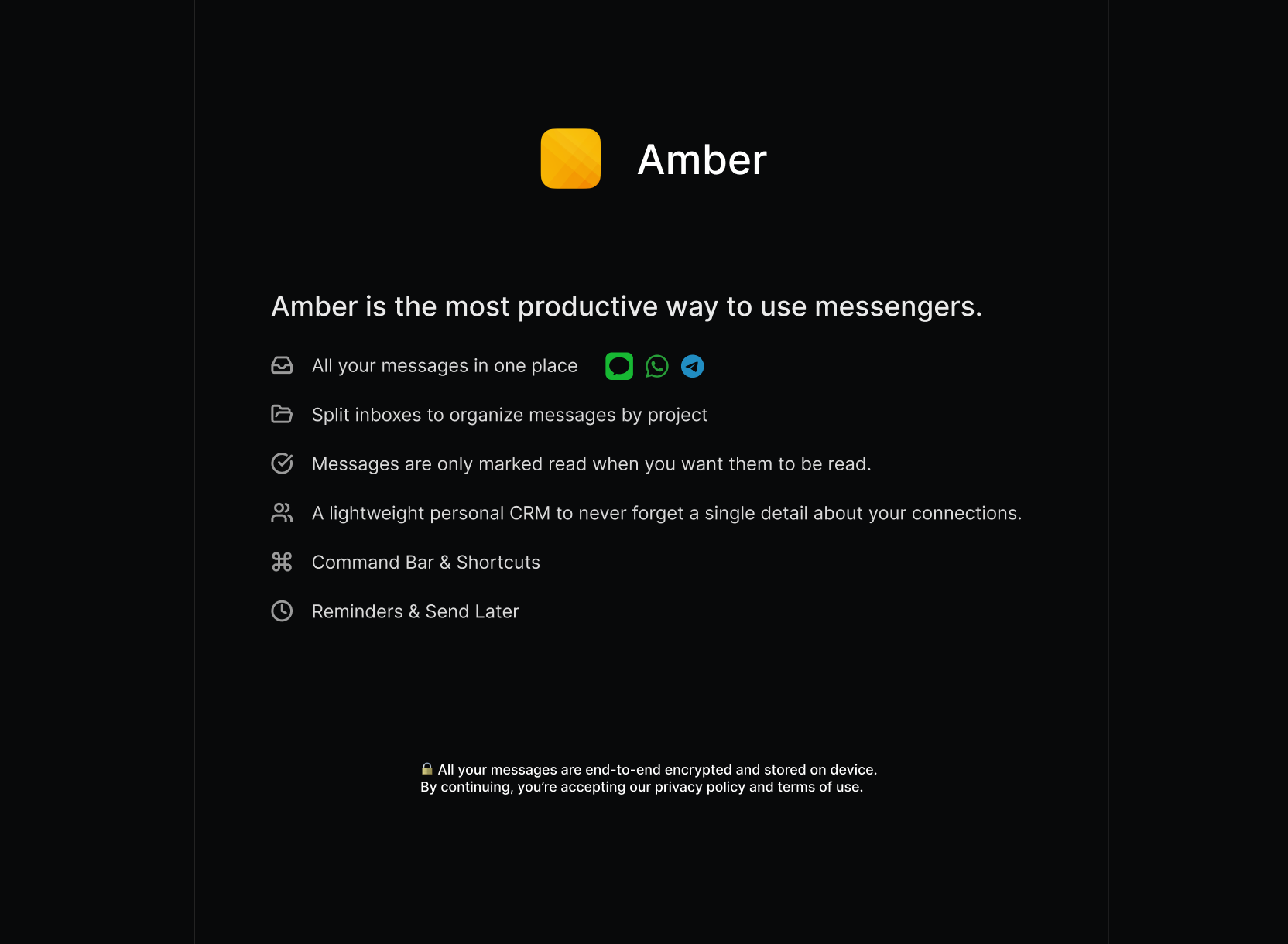 「Amber」は、複数のメッセージアプリ(WhatsApp、Telegram、iMessage)を統合し、効率的にコミュニケーションを管理できるプラットフォームです。ユーザーは、分かりやすいインターフェースを通じてメッセージを整理し、仕事や友人、特定のプロジェクトに集中できるようになります。また、プライバシーを重視し、すべてのメッセージはデバイス上で安全に保存され、エンドツーエンドの暗号化が施されています。