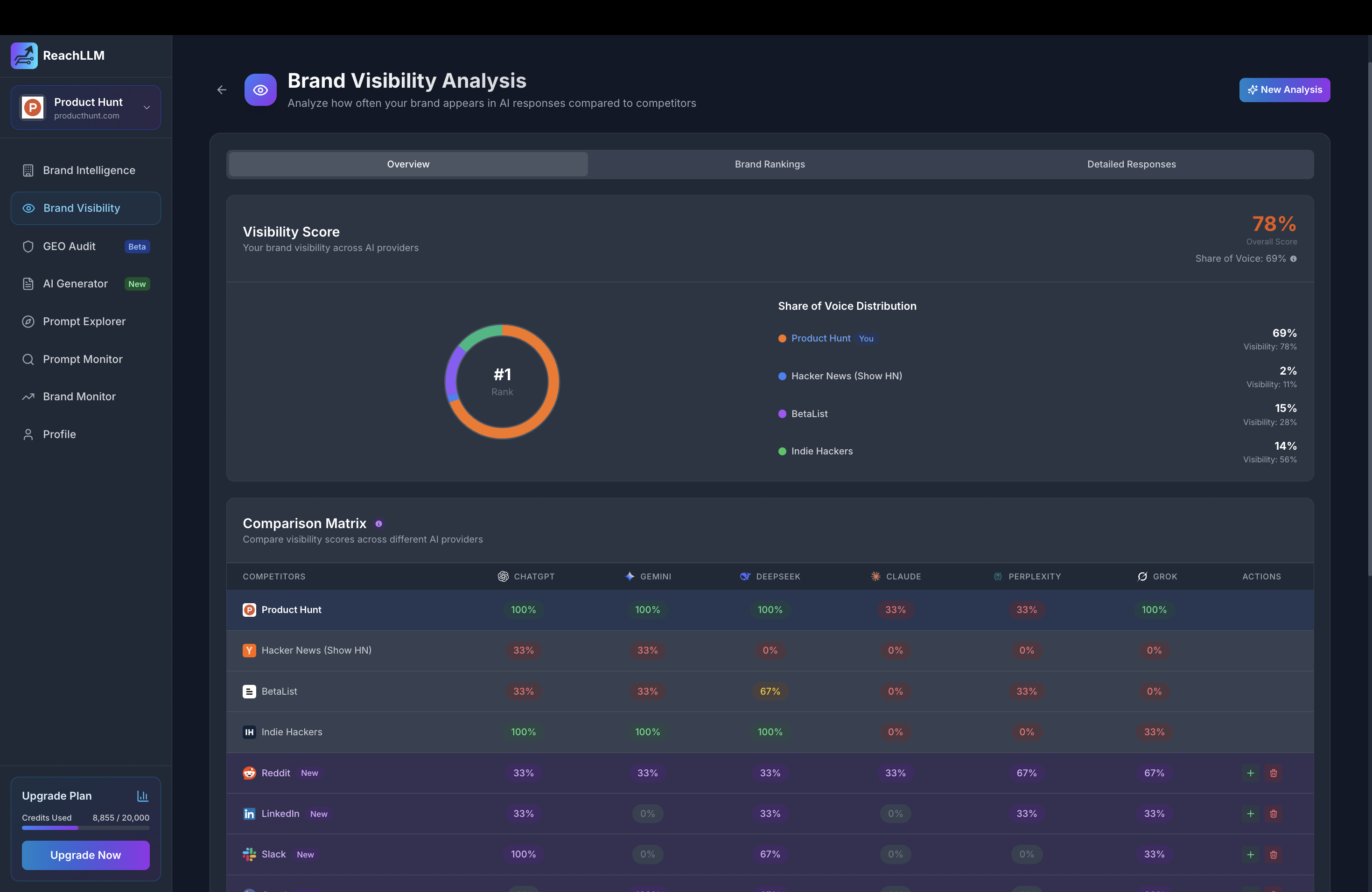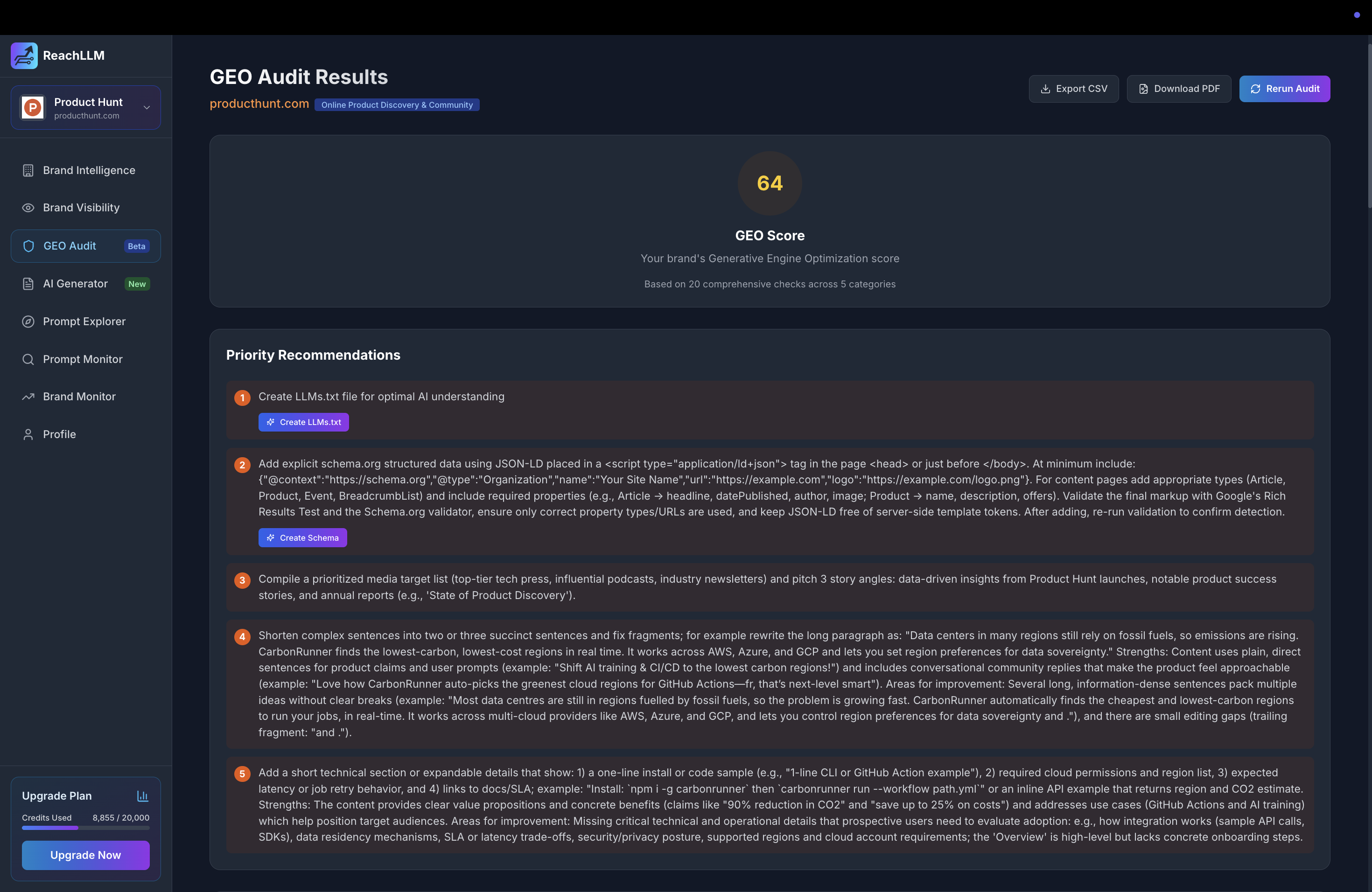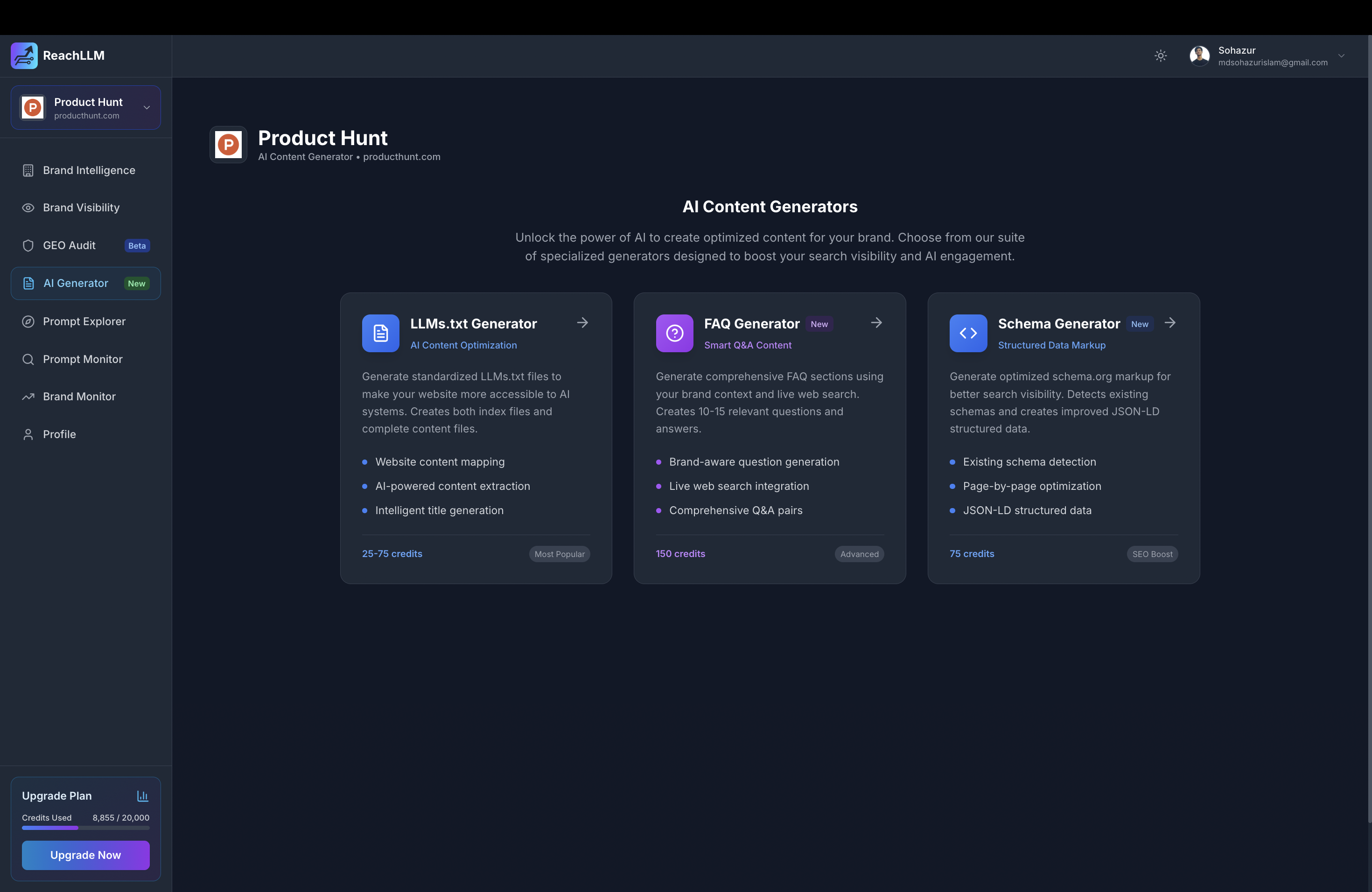 「ReachLLM」は、ブランドの可視性をAI言語モデル(LLM)を通じて追跡し、競合や関連するキーワードを分析できるツールで、特にGEO監査やAIコンテンツ生成機能が注目されています。