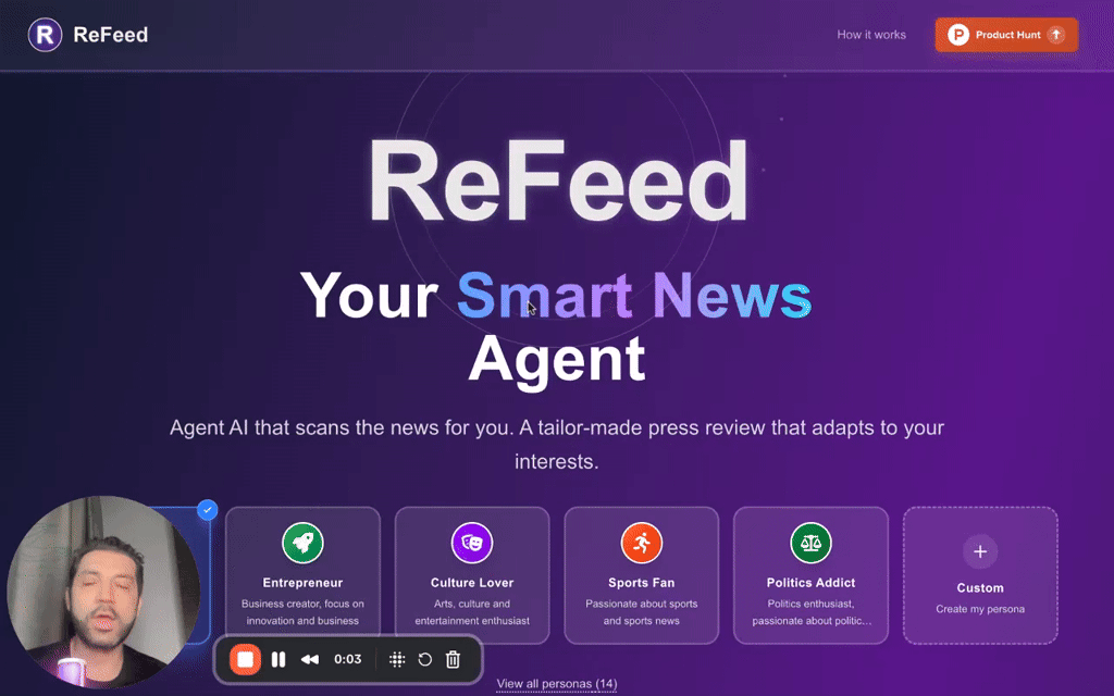 「ReFeed」は、ユーザーが自分の興味や政治的見解に基づいてニュースをカスタマイズできるプラットフォームです。このプロダクトは、200以上の信頼できるメディアソースから情報を集約し、個々の好みに応じた要約、ニュースレター、ポッドキャストを生成します。