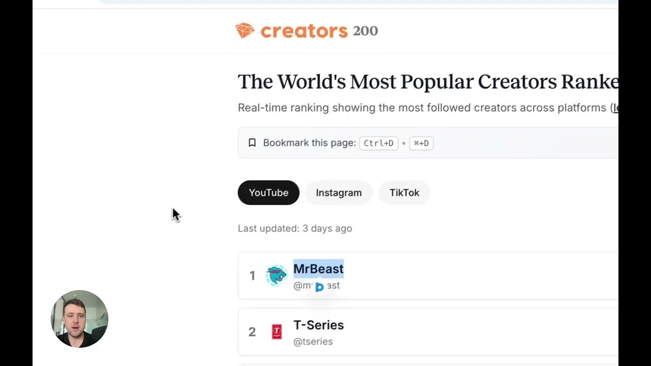「Creators 200」は、世界のトップ200クリエイターを追跡するシンプルなサイトで、フォーブスリストのクリエイター版とも言えるプロダクトです。毎週更新され、自動でランキングがリフレッシュされるほか、ブックマーク機能やメールサインアップも用意されています。