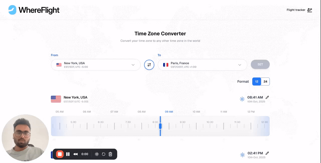 WhereFlightの「Timezone Converter」は、旅行者のためにシンプルで使いやすいインターフェースを提供する時間帯変換ツールです。ユーザーからは、従来の複雑なタイムゾーンコンバータに比べて直感的で快適な使用体験が評価されています。