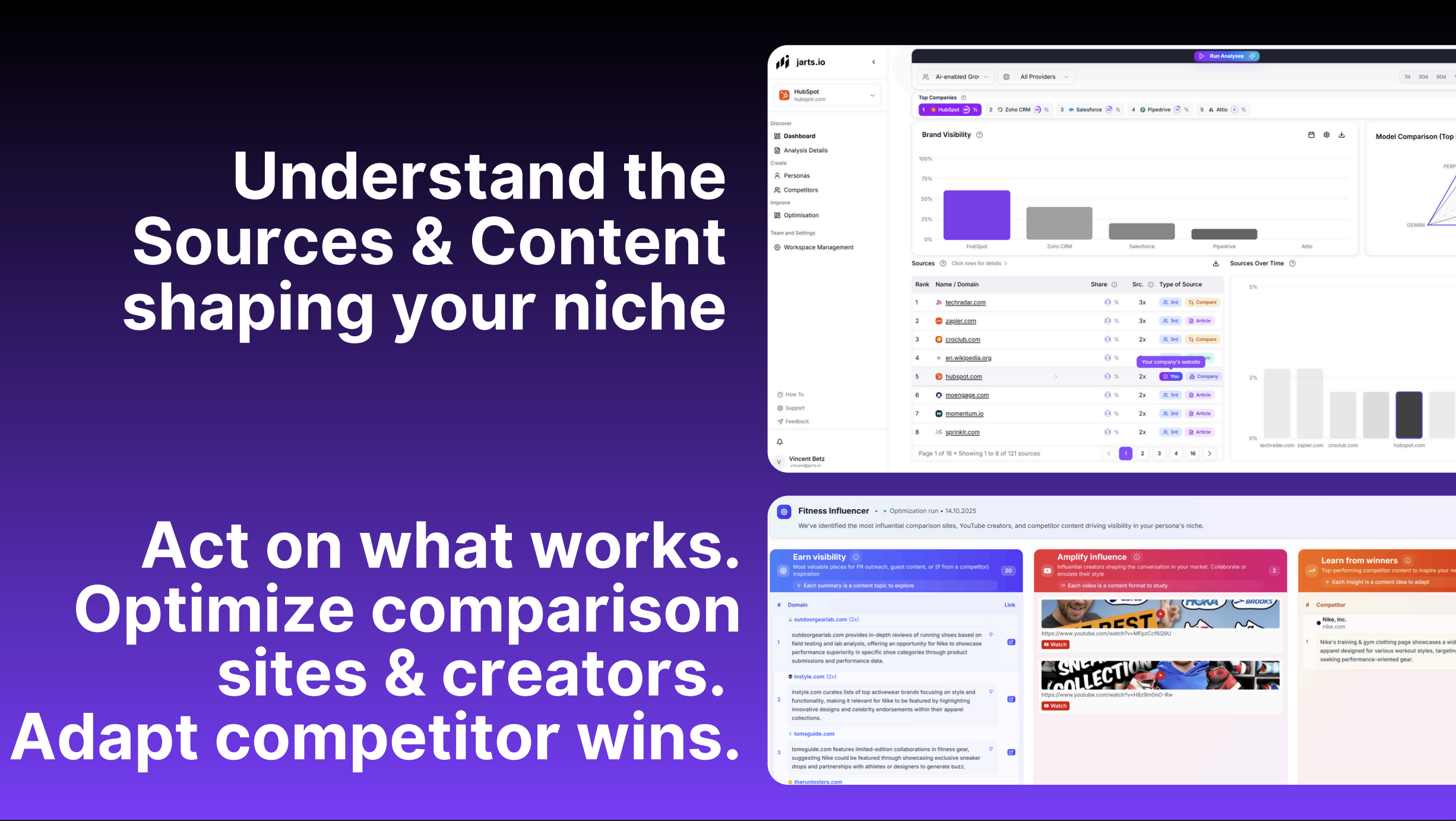 「Jarts.io」は、マーケターがAI検索結果を理解し、競合と比較するための無料ツールで、顧客ペルソナに基づいて即座に最適化のアドバイスを提供します。