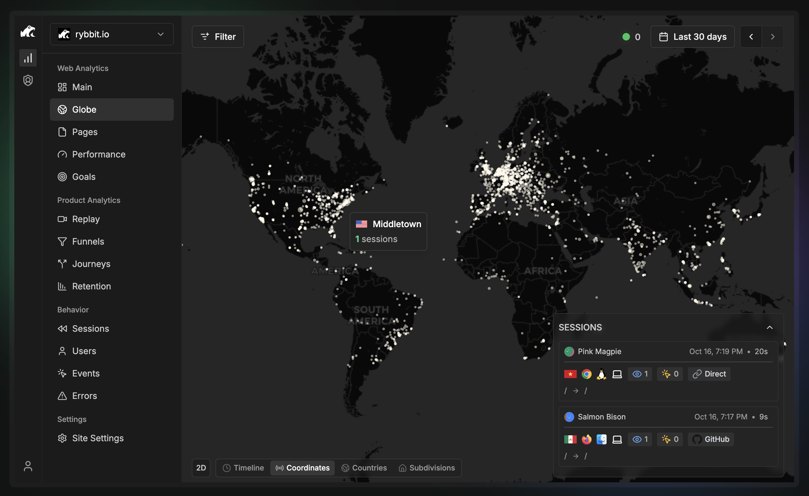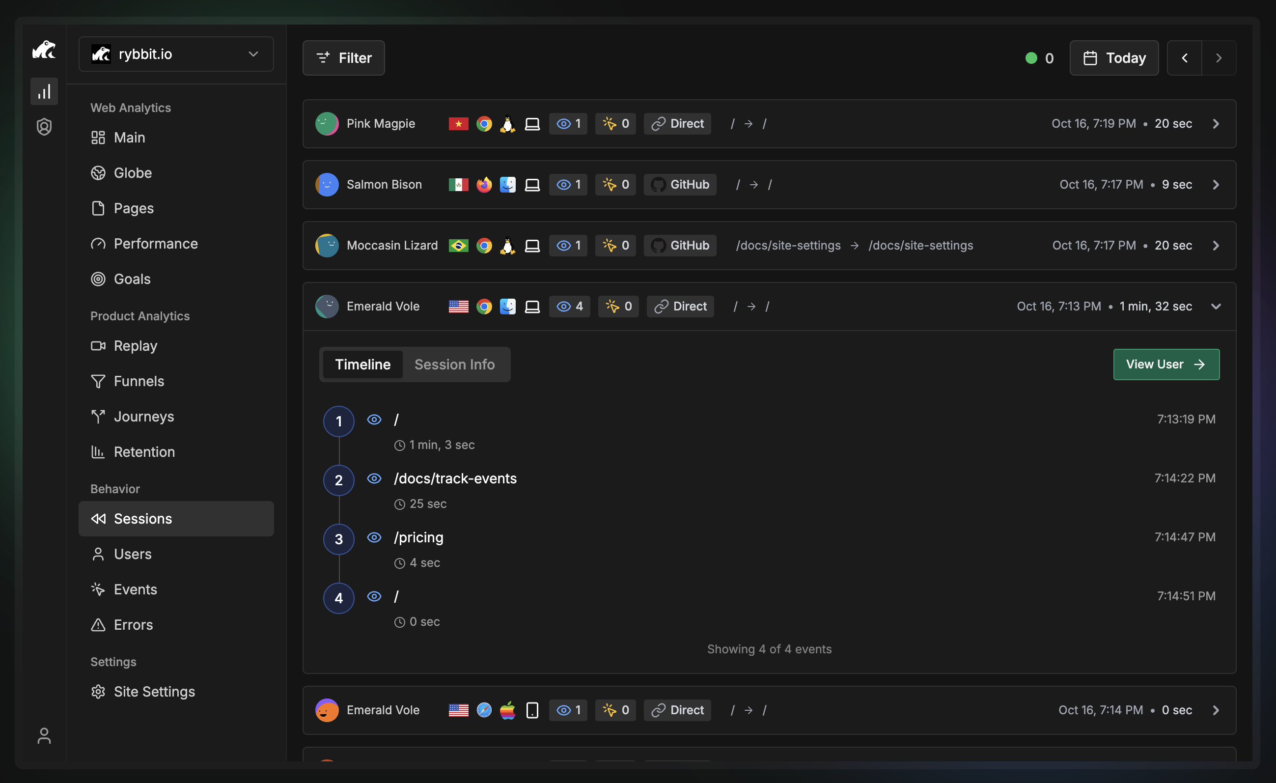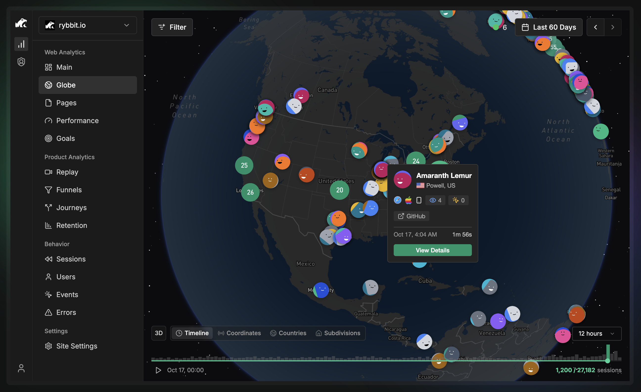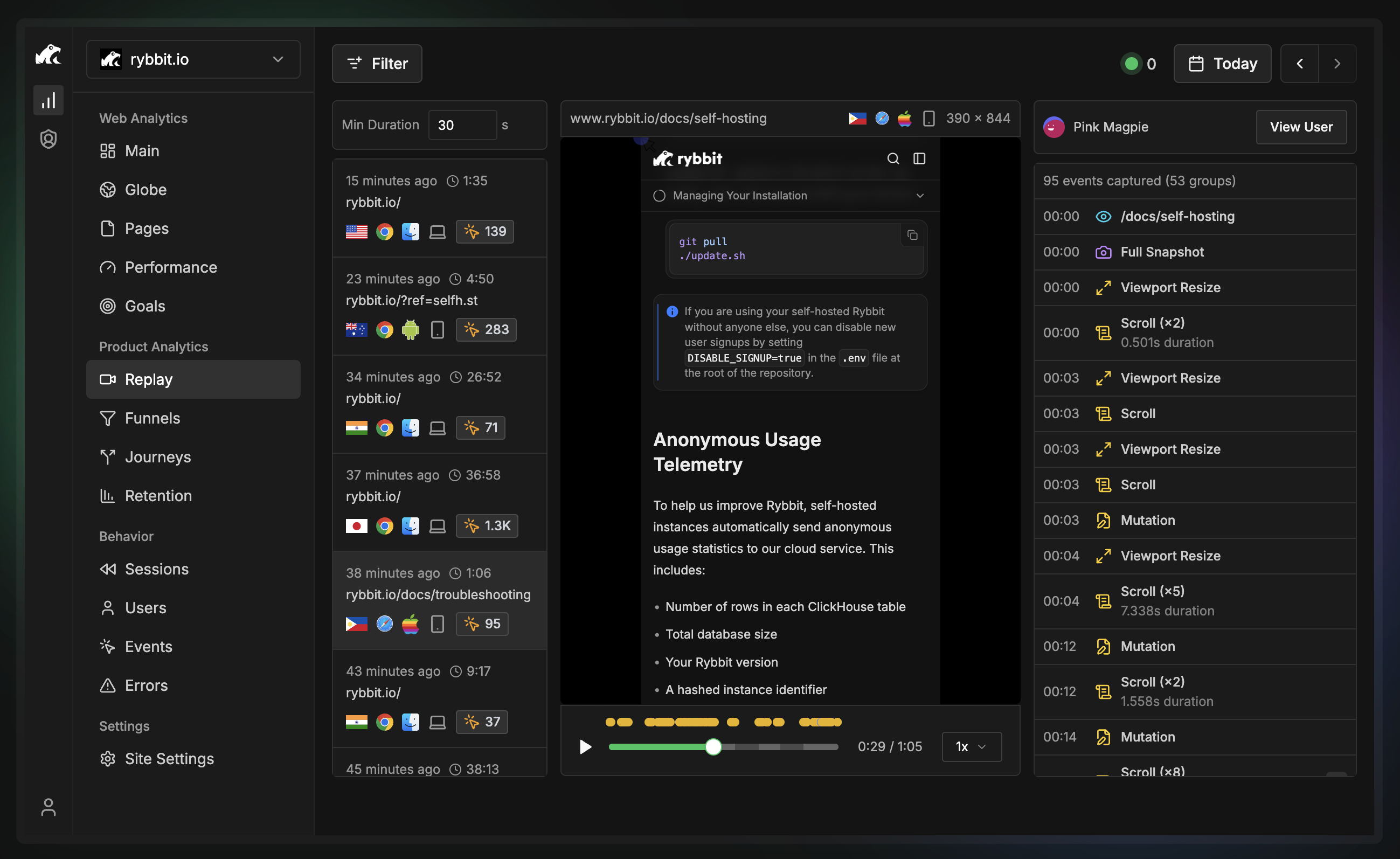 「Rybbit」は、使いやすさを重視したウェブ分析プラットフォームで、クッキーを使用せずGDPRに準拠しており、10以上のプリセットダッシュボードを提供しています。多くのユーザーから好評を得ており、その洗練されたUIやセッションリプレイ機能が特に評価されています。