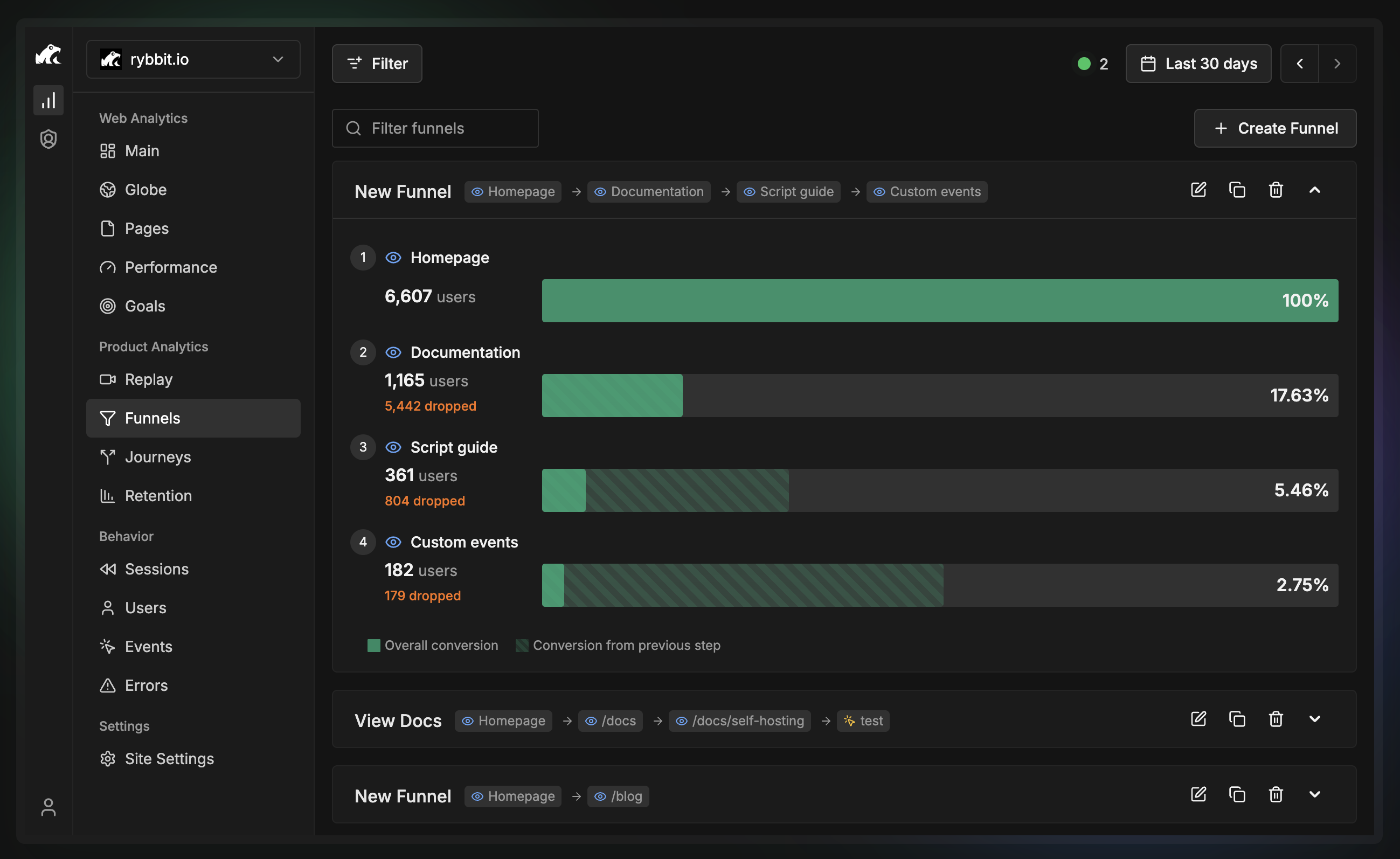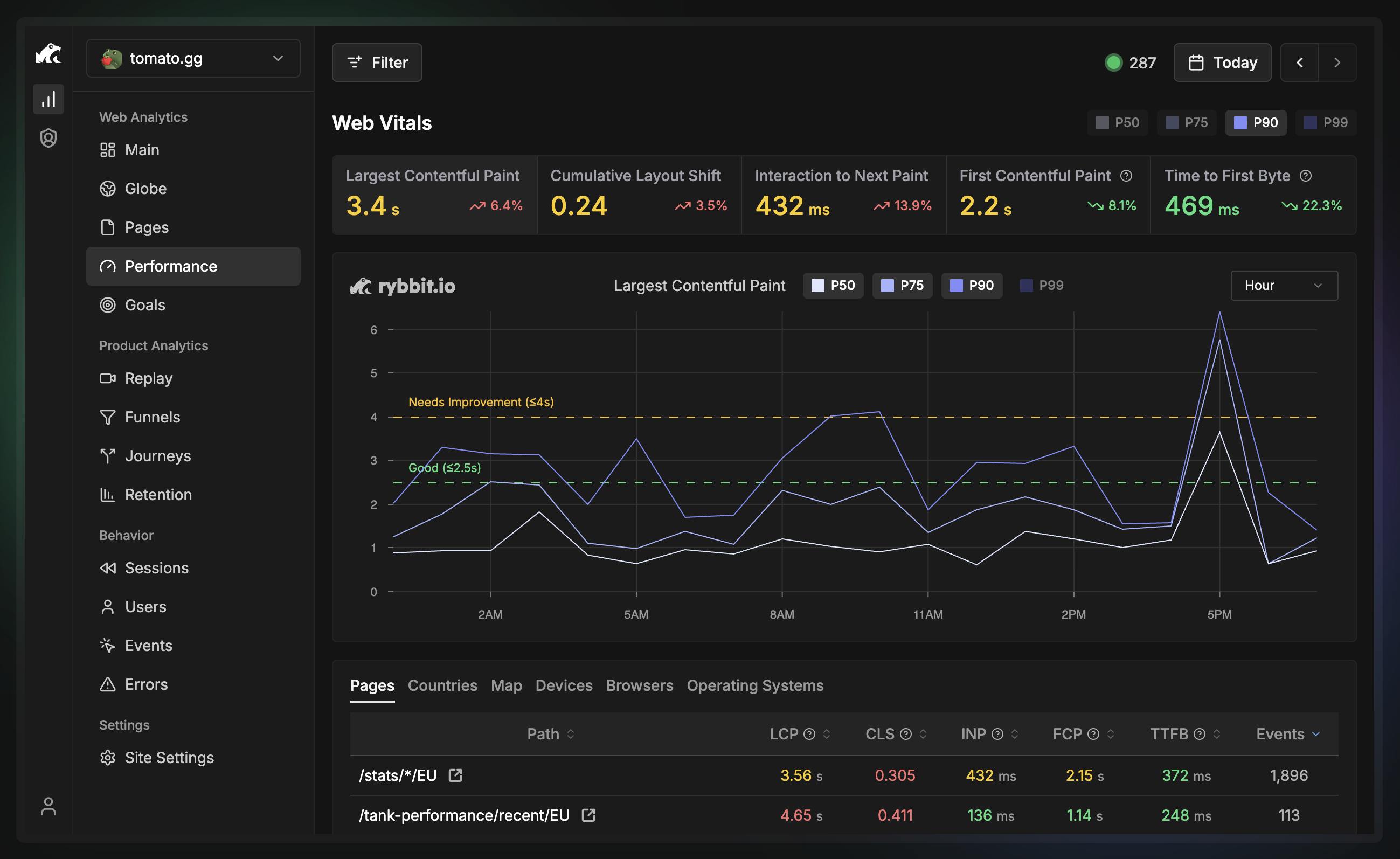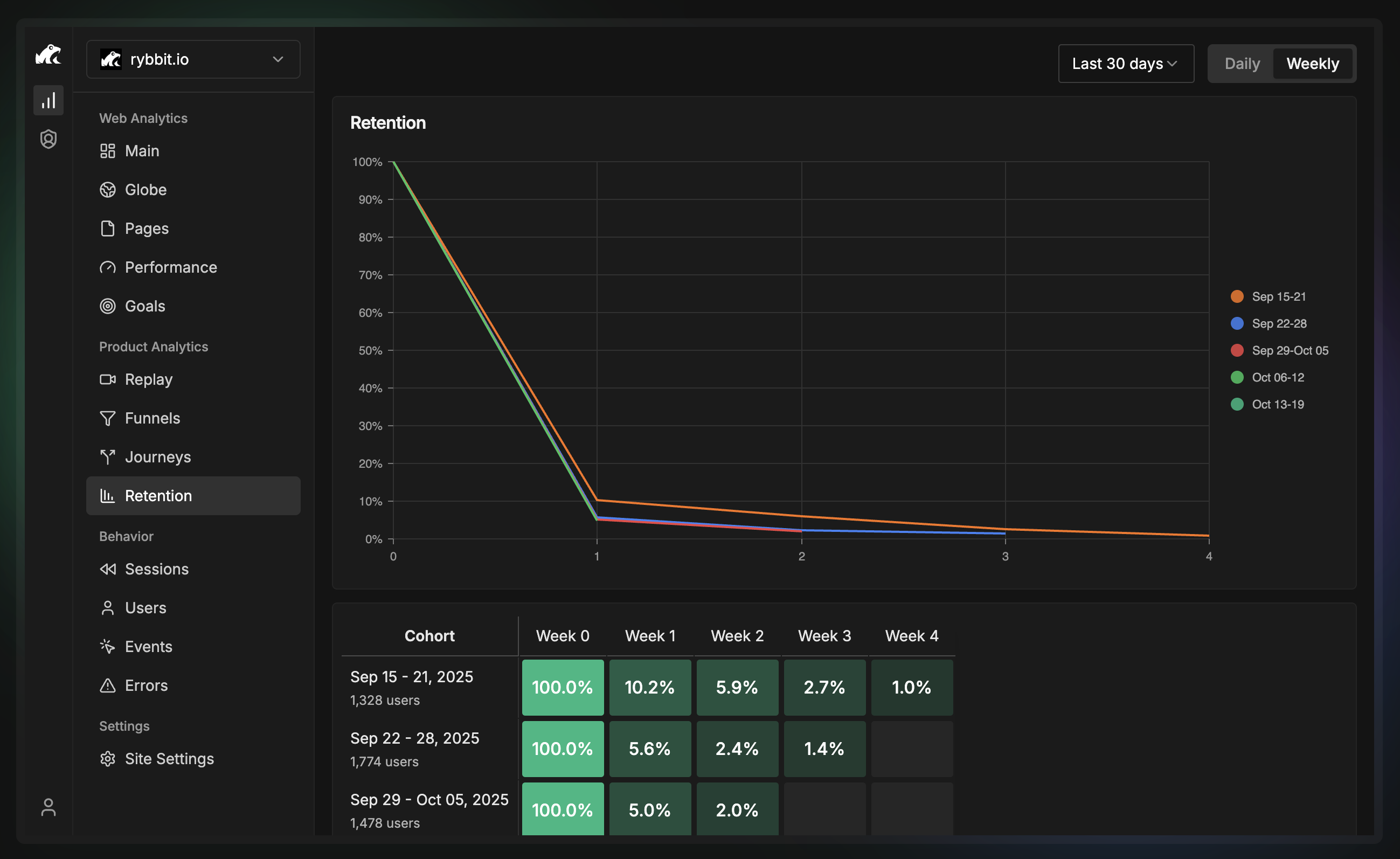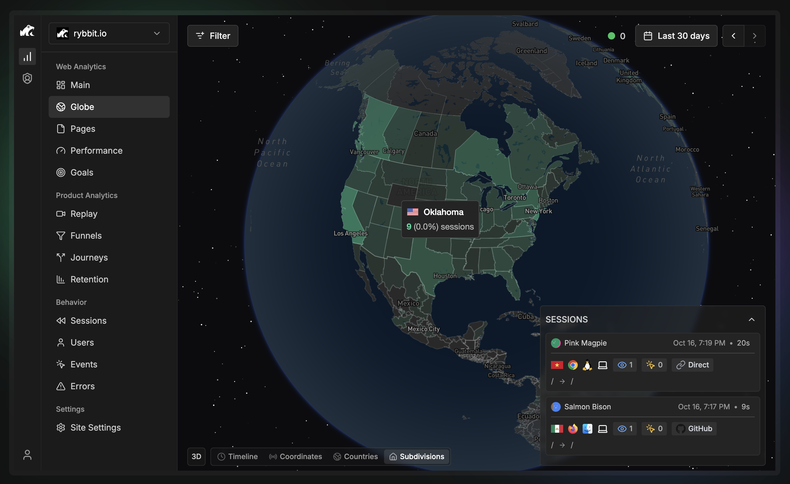 「Rybbit」は、使いやすさを重視したウェブ分析プラットフォームで、クッキーを使用せずGDPRに準拠しており、10以上のプリセットダッシュボードを提供しています。多くのユーザーから好評を得ており、その洗練されたUIやセッションリプレイ機能が特に評価されています。