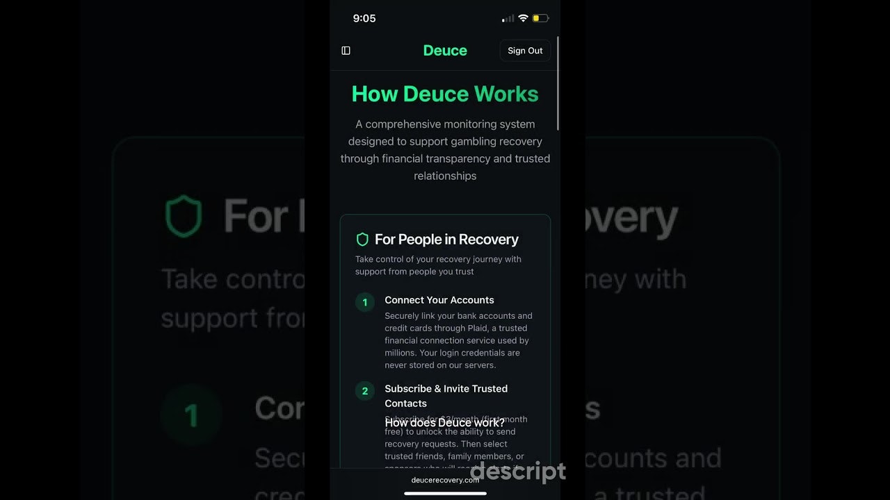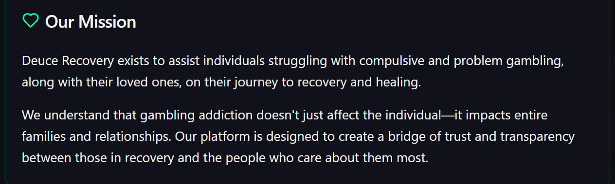 「Deuce」は、ギャンブル依存症の回復を支援するために設計されたスマートな取引監視システムで、オンラインギャンブルの兆候を検知し、信頼できる連絡先に通知します。このプロダクトは、依存症の本人が信頼を再構築するための独立性を持ちながら、家族や愛する人々が情報を得られるようにすることを目的としています。