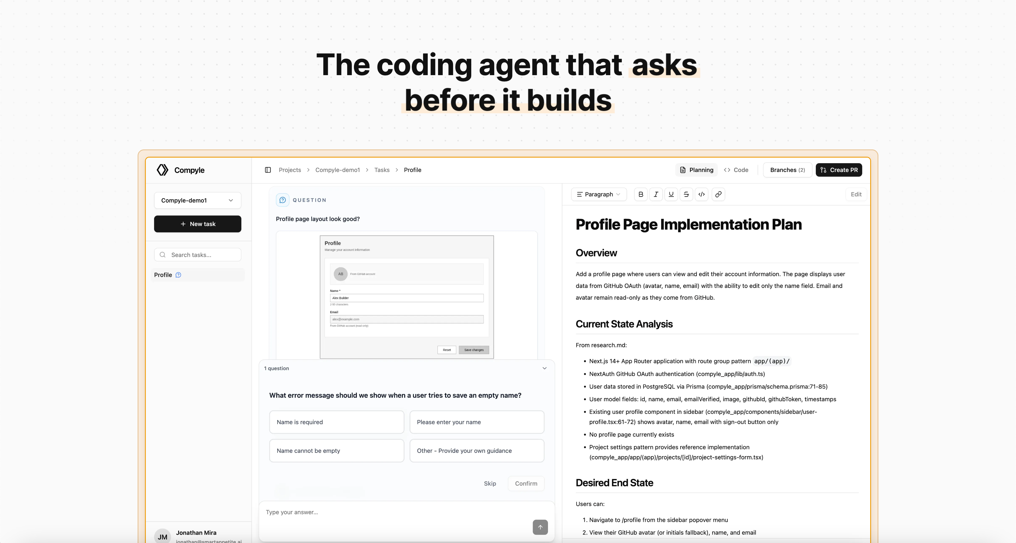 ユーザーは、従来のコーディングエージェントが自律的すぎて作業内容が不明瞭であったことに不満を持っており、Compyleは質問を通じてユーザーの意見を反映し、計画や研究成果物を生成することで、透明性とコントロールを提供します。