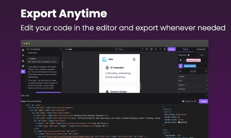 ユーザーは、AIを使ってゼロからプロジェクトを生成したり、既存のウェブサイトをインポートして視覚的に編集したり、特定の変更をAIに依頼することができます。また、必要に応じて直接コードにアクセスすることも可能です。プロジェクト完成後は、ワンクリックで公開したり、自分のドメインを接続したり、任意のホスティングにエクスポートすることができます。