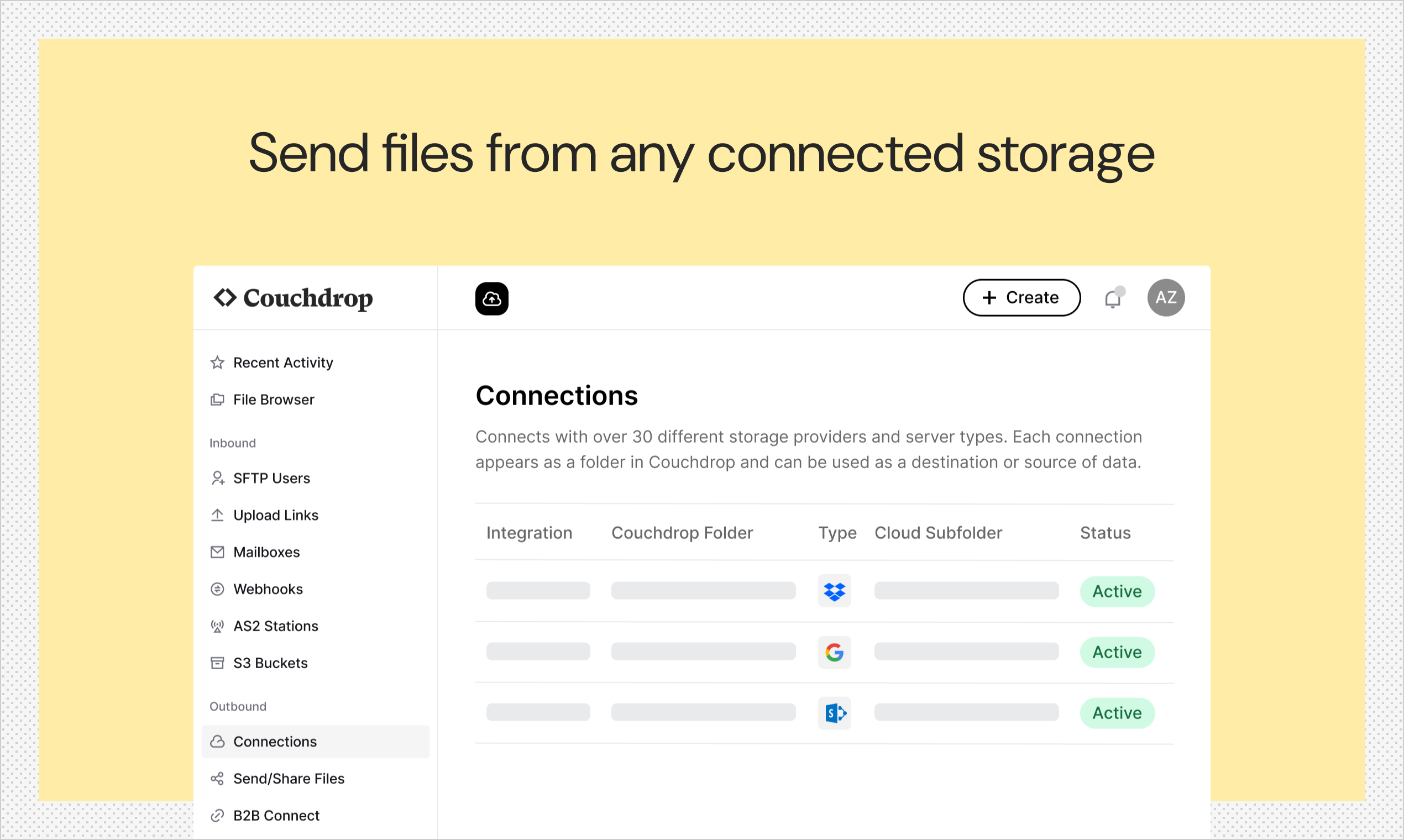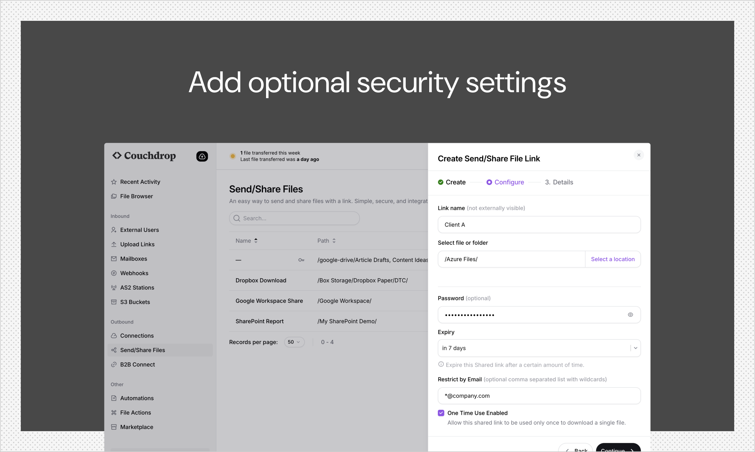 「Send/Share Files by Couchdrop」は、安全にファイルを外部ユーザーに送信できる機能を提供し、HIPAAやGDPRなどの規制に対応したファイル共有を可能にしています。ユーザーはファイルを選択し、オプションでパスワードや有効期限を設定してリンクを共有できるため、メールよりも安全性が高いと評価されています。
