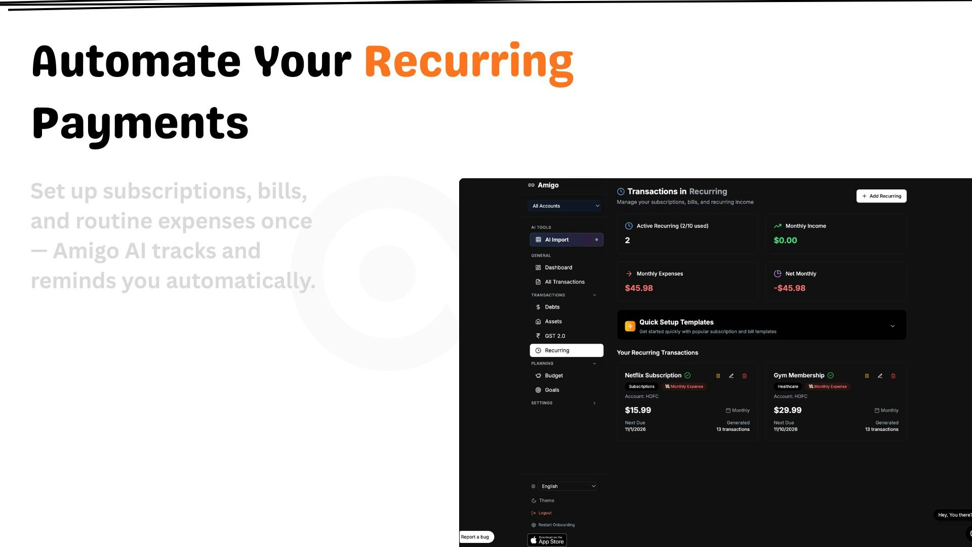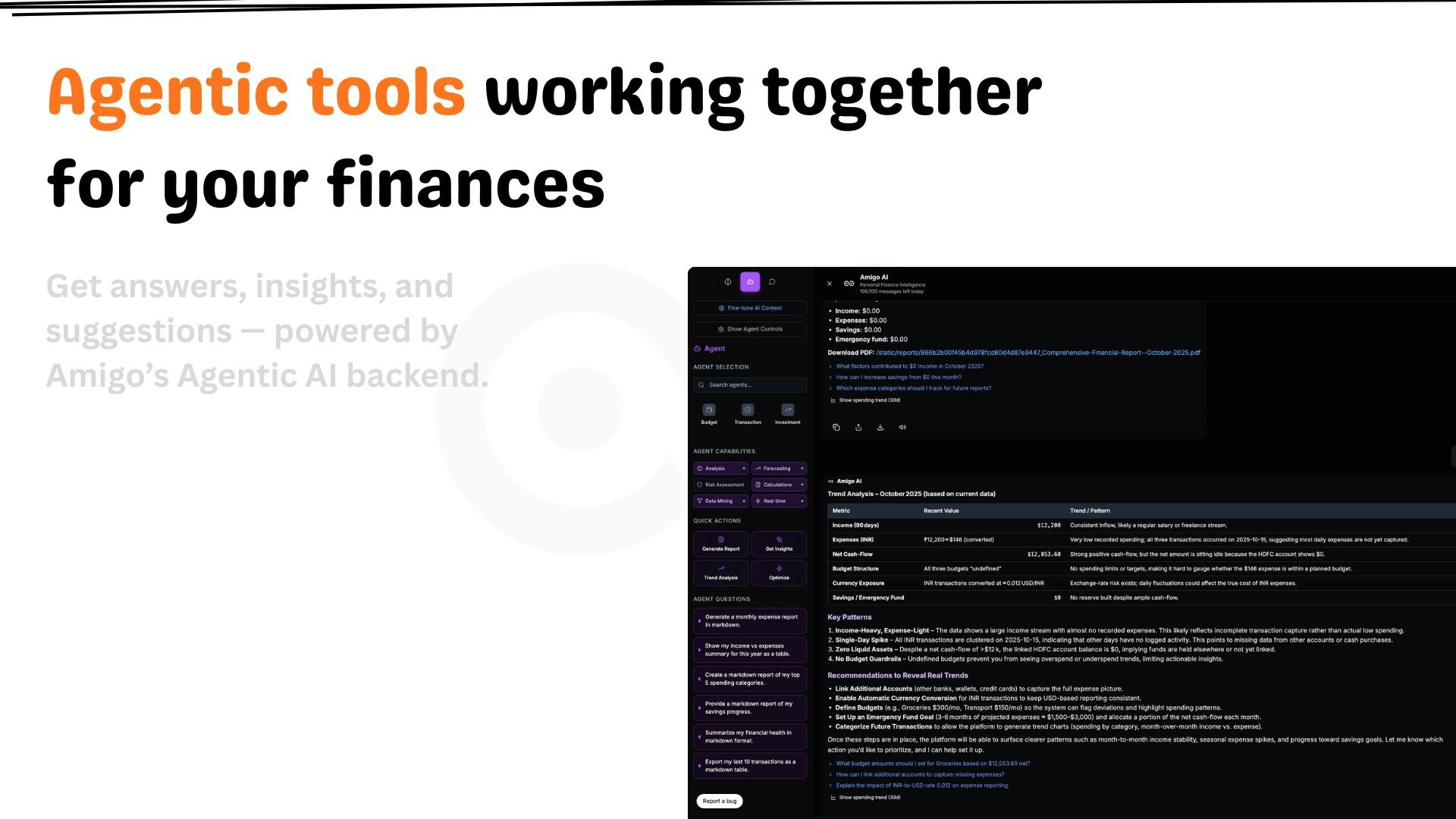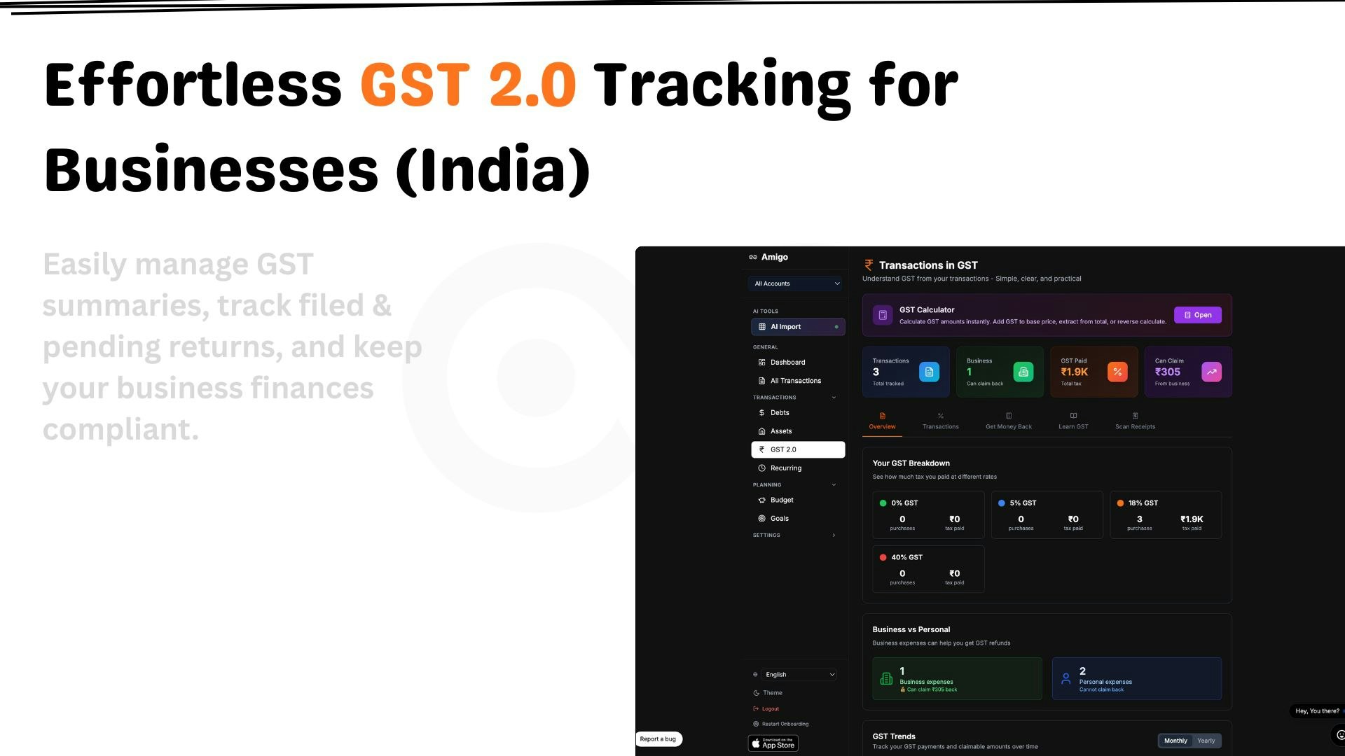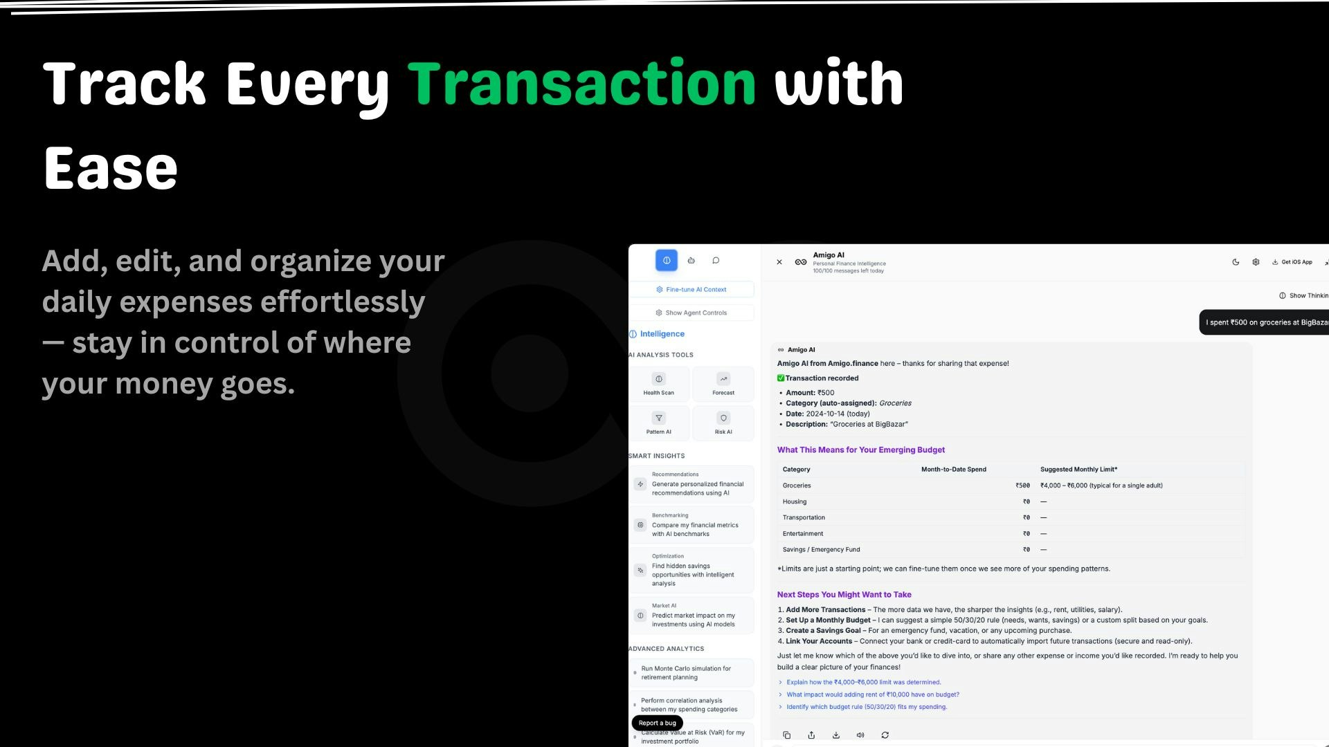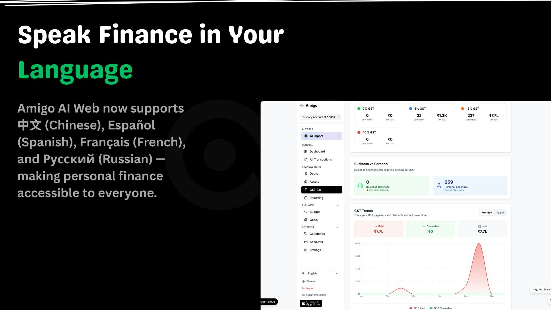 「Amigo AI」は、個人の財務管理をサポートするウェブアプリで、AIを活用したチャット機能やPDFの金融データ解析、複数口座の管理、予算設定が可能です。特にインドのGSTに対応しており、多言語サポートも魅力です。