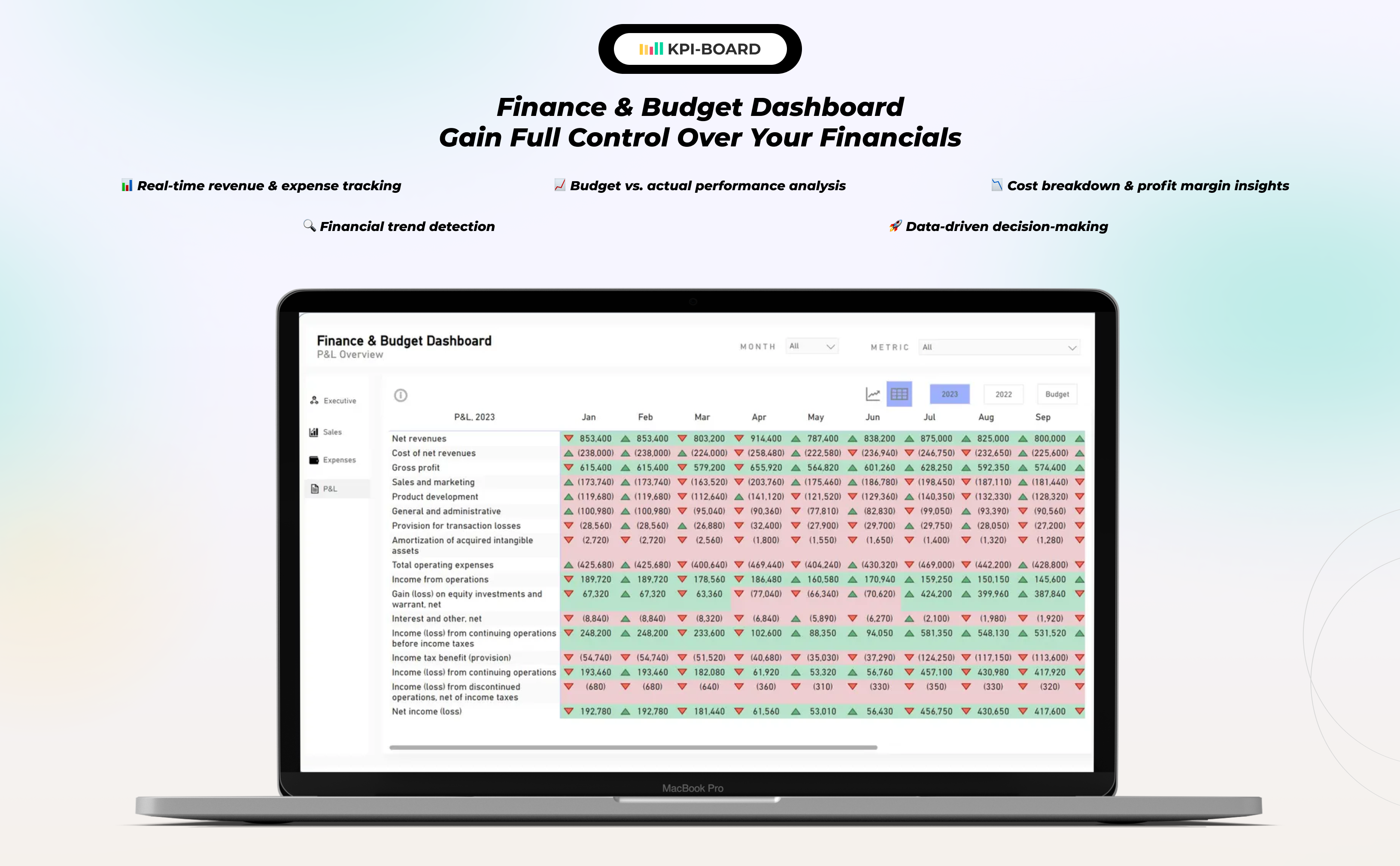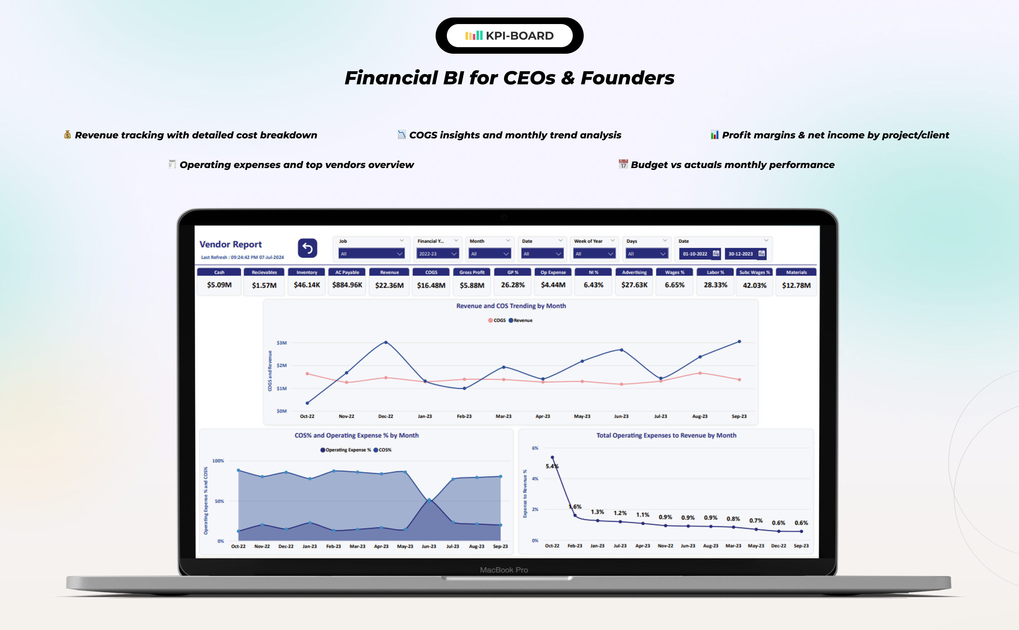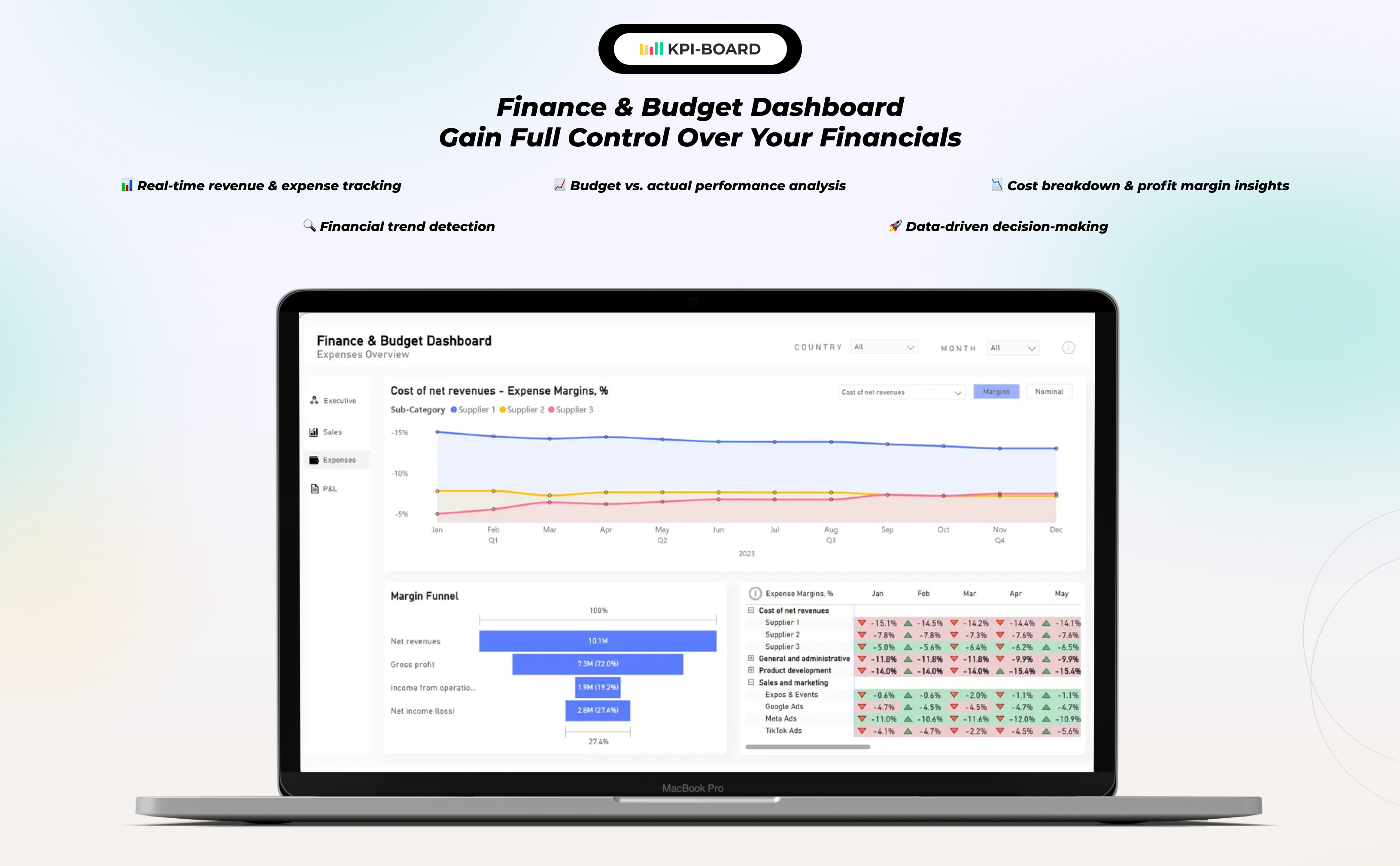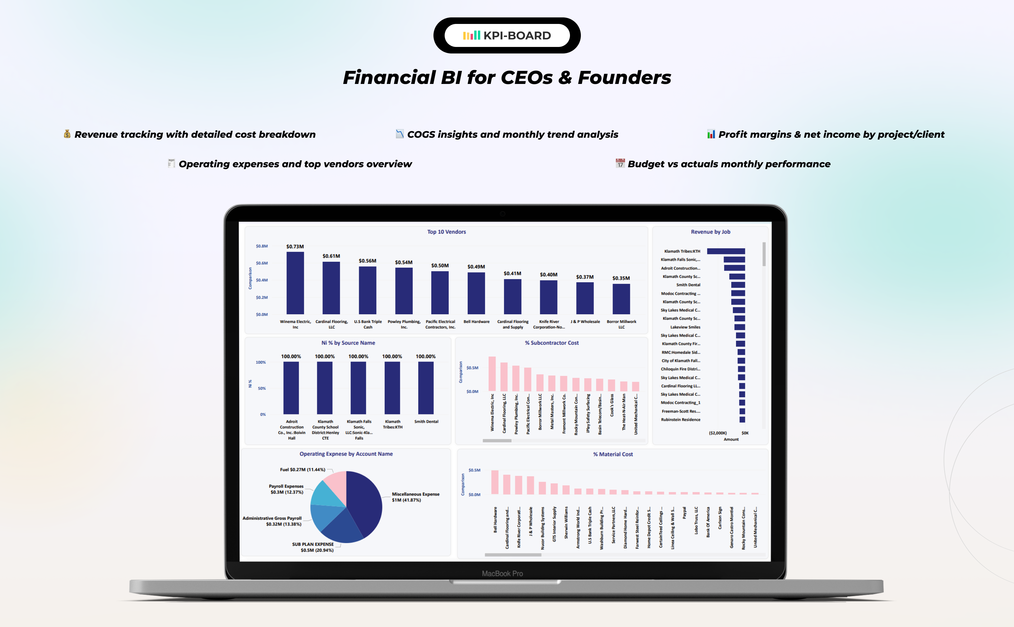 KPI BOARDは、報告の混乱を解消するために開発されたビジネスインテリジェンスツールで、手動ダッシュボードや不整合なツールに費やす時間を削減し、迅速なデータの統合と自動化を提供します。多くのクライアントが数日で効果を実感できる点が高く評価されています。