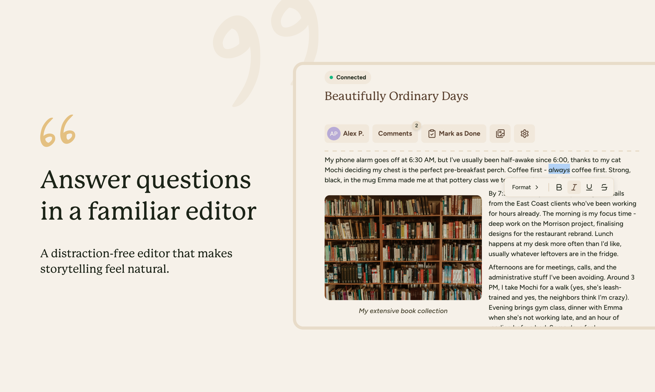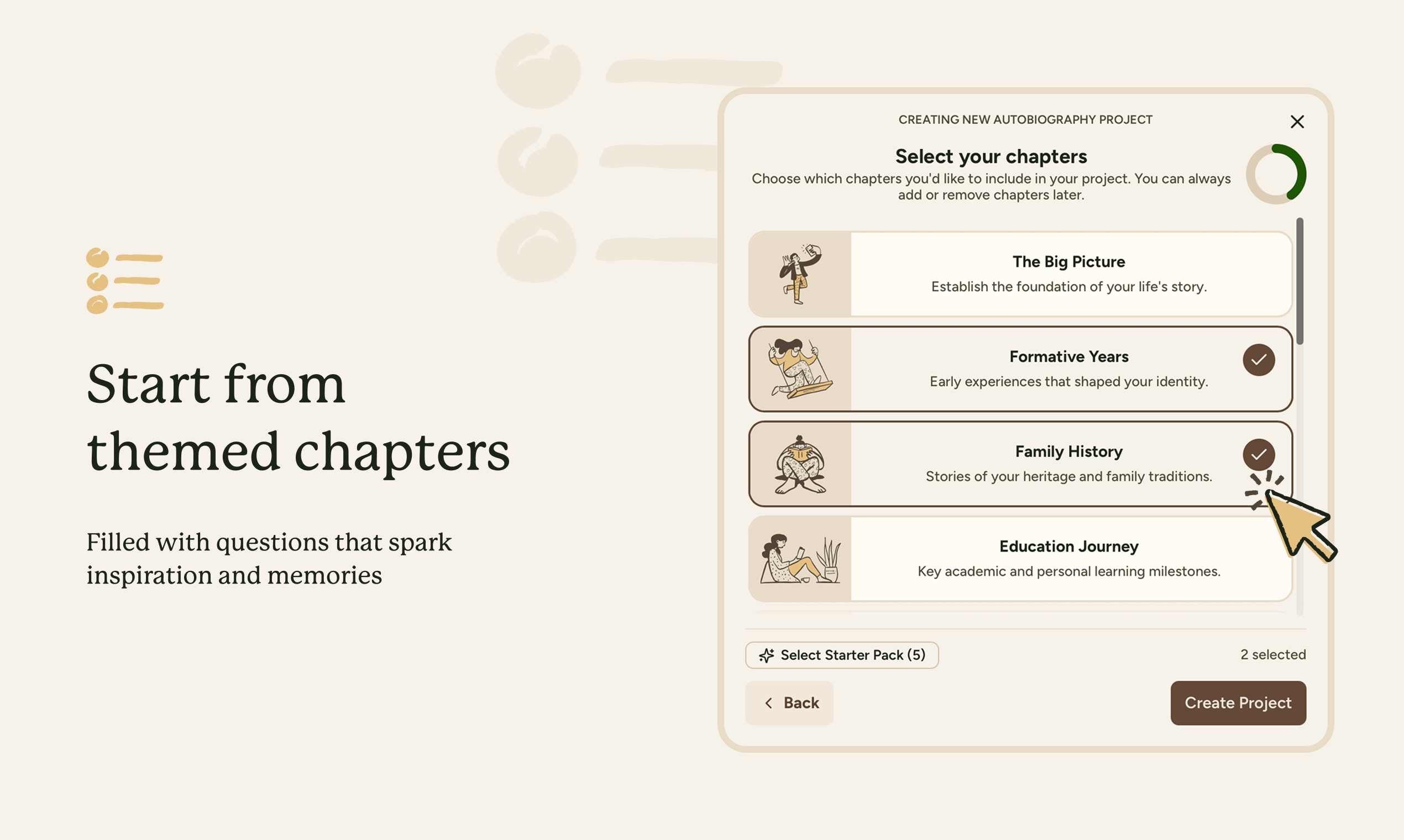 Keepsakeの特徴としては、書き進めるペースを自由に選べることや、無制限の共同作業者を招待できる点が挙げられます。また、AIによるゴーストライティング機能があり、詳細な記憶を引き出す手助けをします。定期購読者には、印刷された本のクレジットや無料のPDFダウンロードが提供される点も魅力的です。