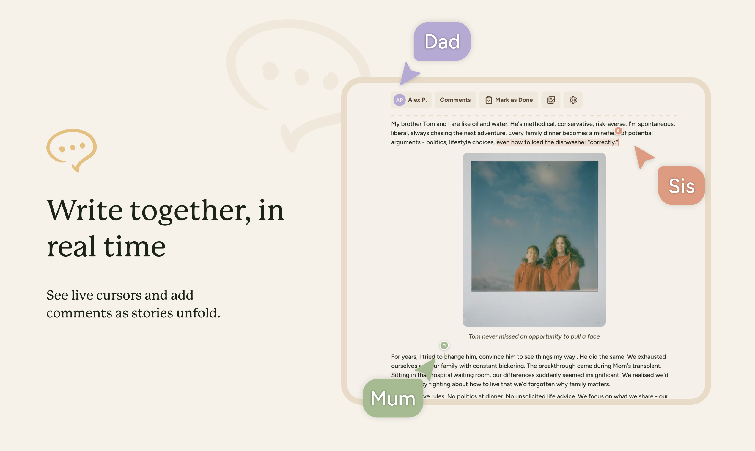 ユーザーからは、AIゴーストライティングがどのように複数の声を扱うかについての興味や、Keepsakeの今後の機能拡充に期待する意見が寄せられています。全体として、Keepsakeは家族のストーリーテリングをより自然で楽しいものにすることを目指しています。