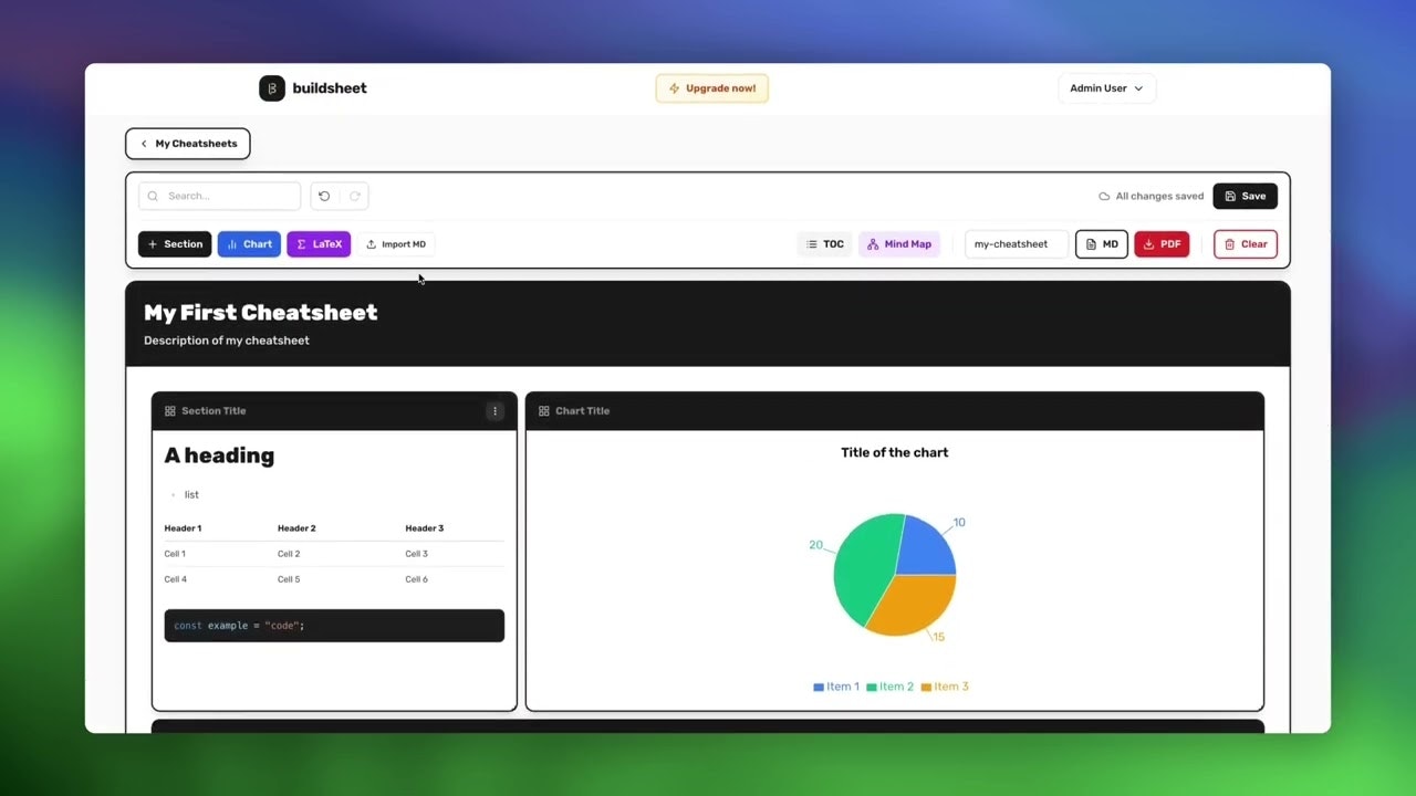 「Buildsheet」は、Notionに圧倒されることがあるユーザー向けに作られた、直感的なドラッグ&ドロップ機能を持つチートシート作成ツールです。Markdownでの記述やKaTeXによる数式作成、チャートへの変換、マインドマップでの視覚化が可能で、多機能性が評価されています。