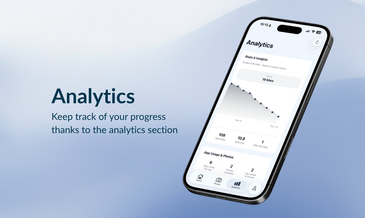 「StopBite」は、爪を噛む習慣を克服するためのアプリで、ユーザーは噛んだ回数を記録し、進捗を写真で確認し、分析を通じてモチベーションを維持することができます。