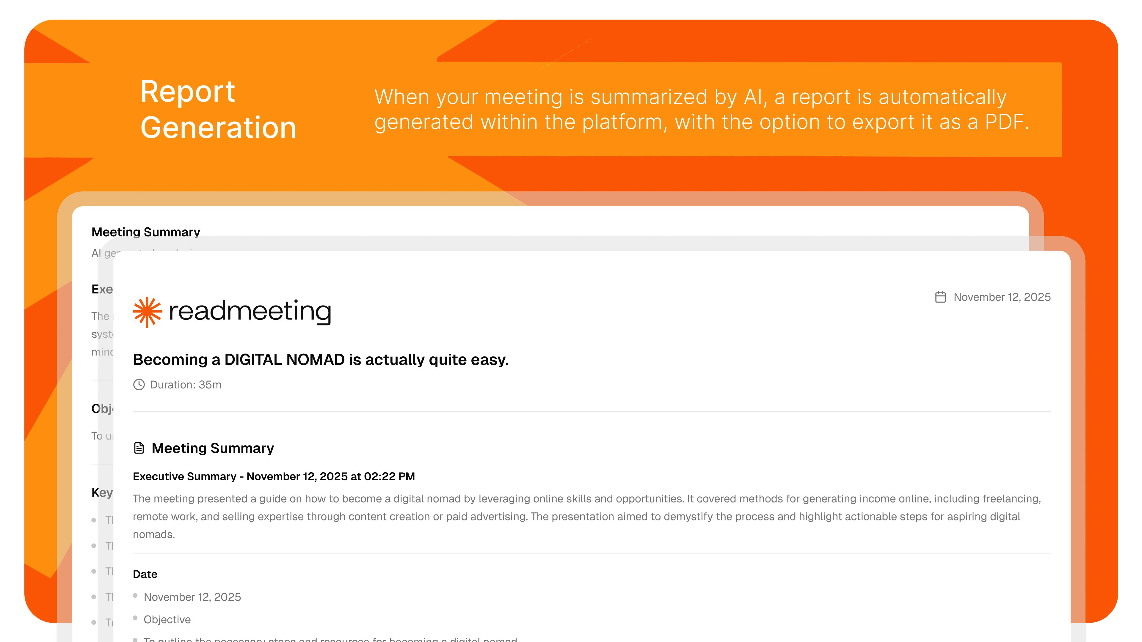 「ReadMeeting」は、会議を自動で録音、分析、要約し、重要な瞬間やアクションアイテムを明確に提供するプラットフォームです。ユーザーは、簡単なクリックで会議内容をキャプチャし、AIによる迅速なレポートを得られ、無駄な時間を省けると高く評価しています。