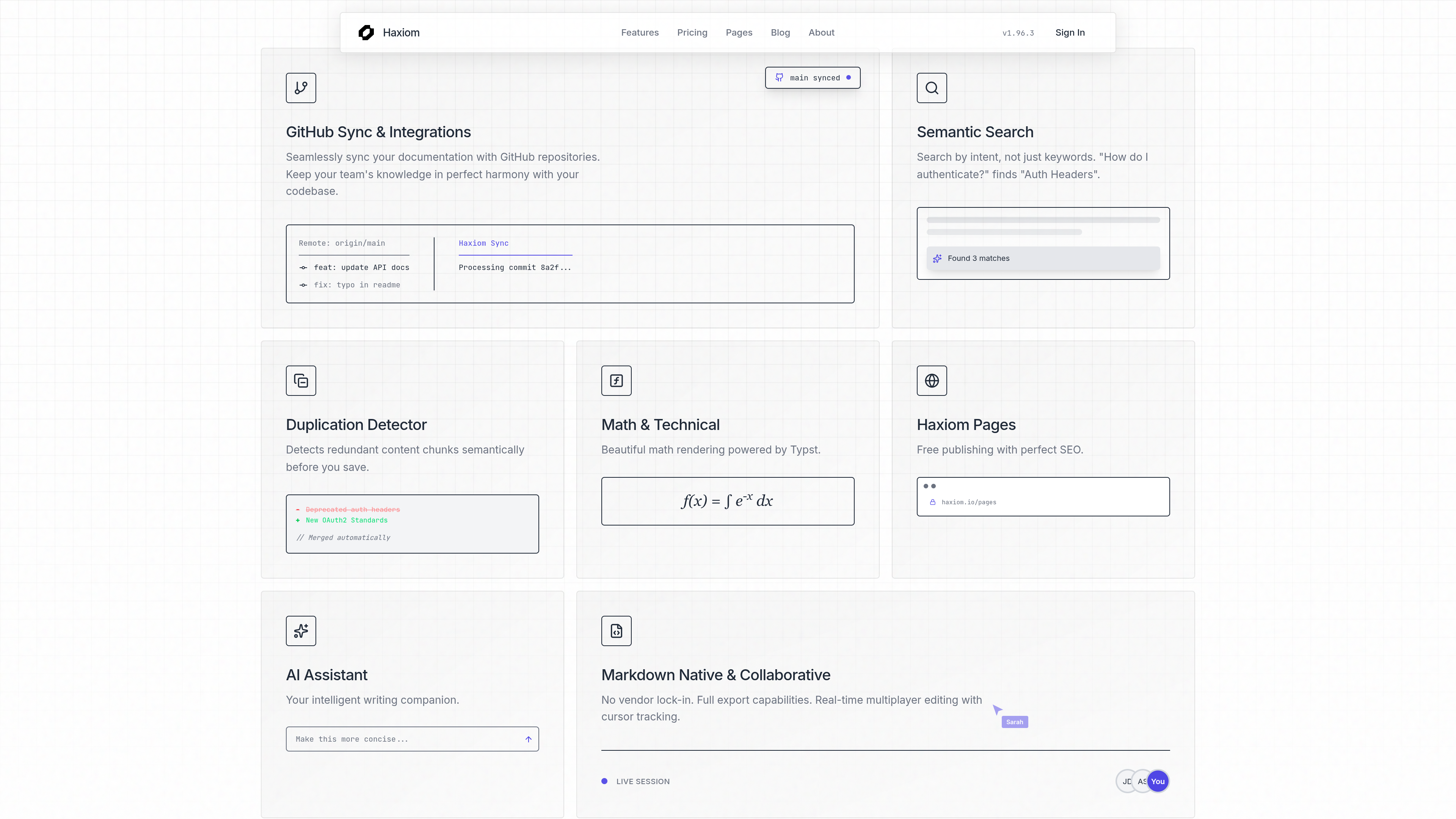 「Haxiom」は、企業のウィキが直面する問題を解決するために開発された、AIを活用した文書管理ツールです。特に開発者とビジネスチーム向けに設計されており、Markdown形式での文書作成、テンプレートへの自動適合、リアルタイムコラボレーションなどの機能を提供します。ユーザーは、ドキュメントの重複や古い情報を防ぎ、知識ベースを正確かつ信頼性のあるものに保つことができます。