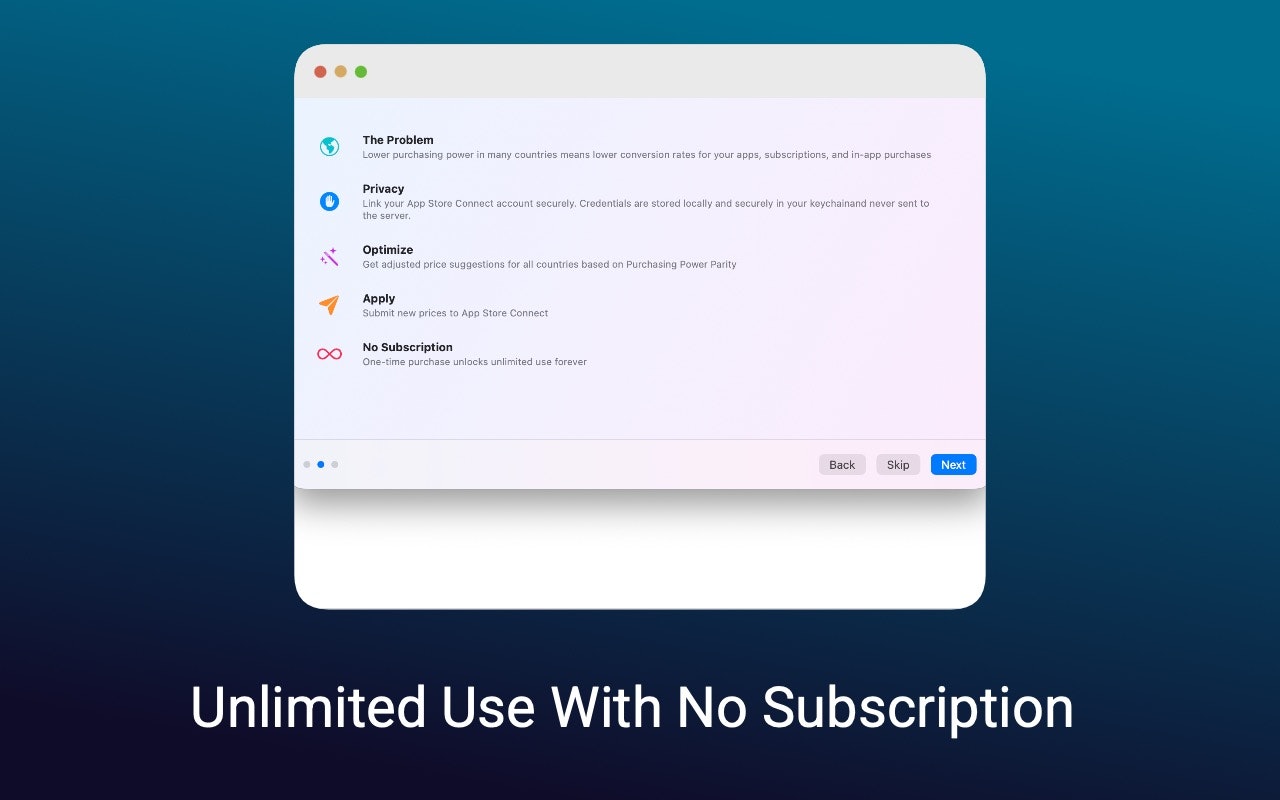 「Price Equalizer」は、App Storeでの価格設定を各国の購買力に基づいて自動的に調整するアプリです。このアプリは、175カ国の価格を世界銀行の購買力平価のデータを用いて最適化し、海外でのコンバージョン率向上を目指しています。