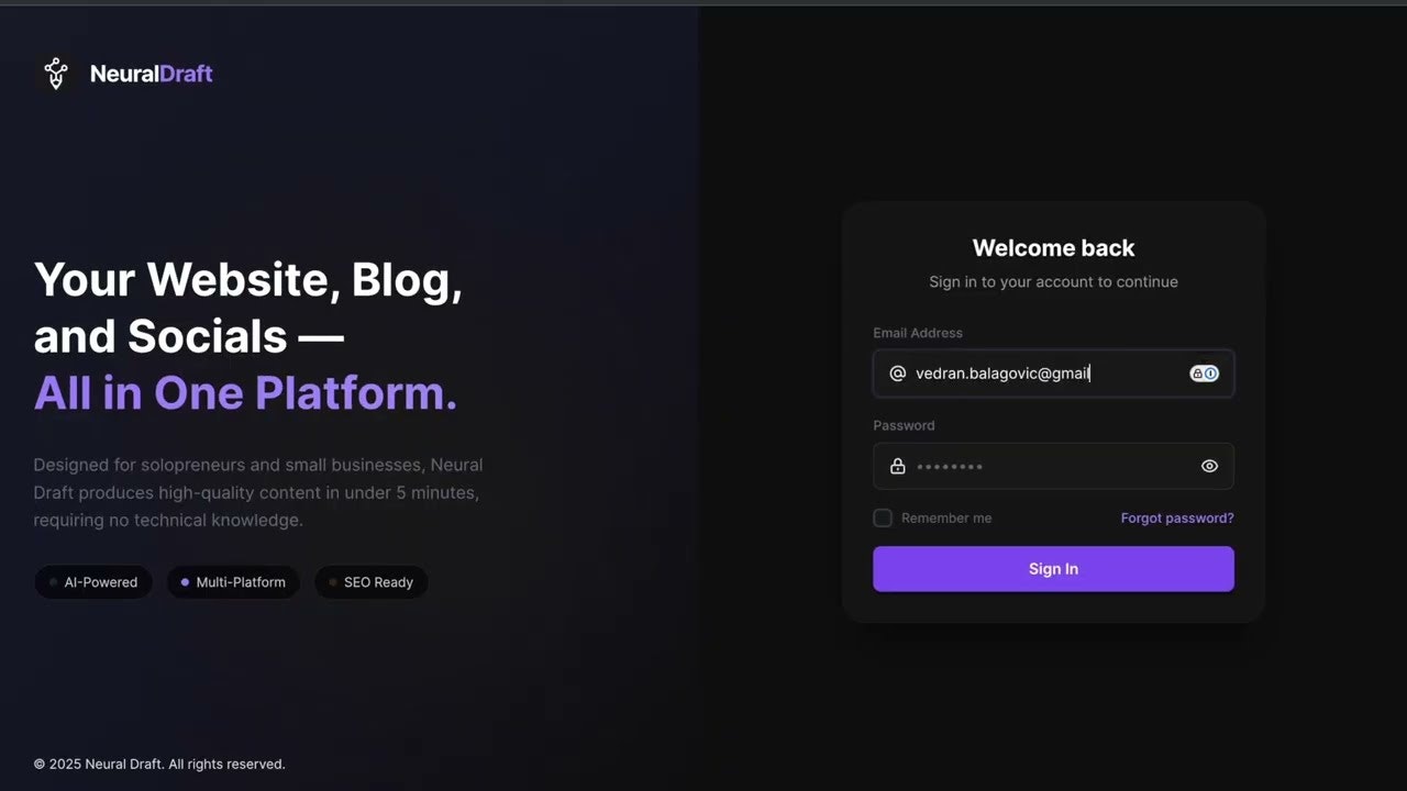 「Neural Draft」は、コンテンツ作成をフルタイムの仕事にせずにオンラインでの存在感を高めたい人々のために開発されたツールです。このプロダクトは、AIを活用したSEOブログ記事の生成、シンプルなウェブサイト作成、ソーシャルコンテンツへの変換、多言語翻訳、スケジュール管理を一つのプラットフォームで提供します。