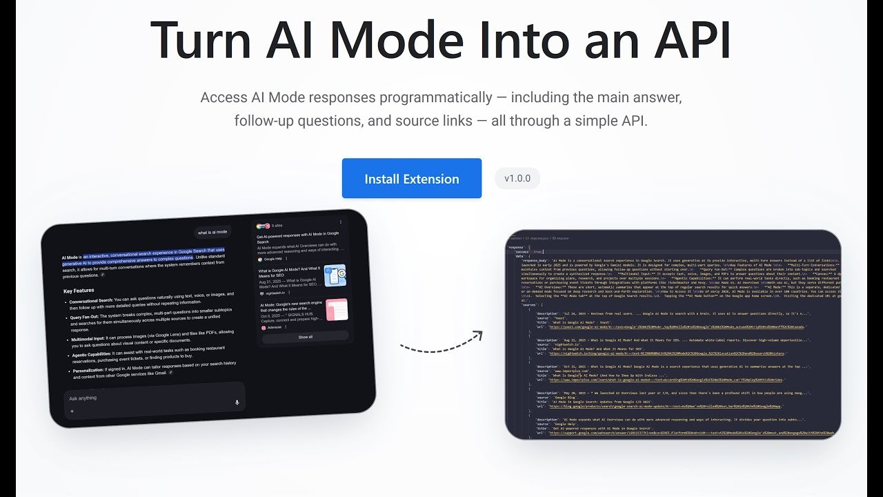 「AI Mode API」は、GoogleのAI Modeをプログラムから利用するためのブラウザ拡張機能で、ユーザーにプライベートなAPIエンドポイントを提供します。これにより、スクリプトやターミナルからPOSTリクエストを送信し、AI Modeとやり取りが可能になります。