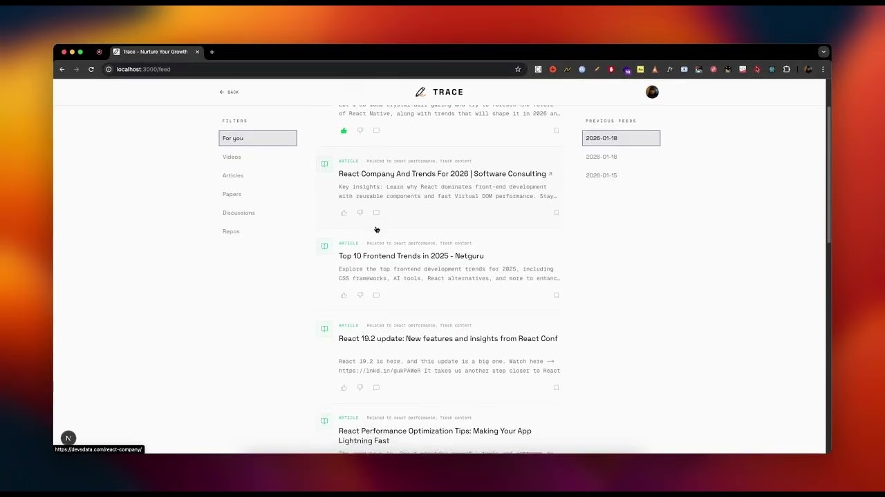 「Trace」は、ユーザーが興味を持つ情報を集めて提供するフィード型のプロダクトで、注意を奪わずに情報を効率的に追跡することを目的としています。現在は、興味を入力することで一般的なフィードにアクセスでき、3日間の無料トライアル後に月額$2.99で利用可能です。このプロダクトは、ユーザーのフィードバックを学習しながら改善を続けていく方針です。
