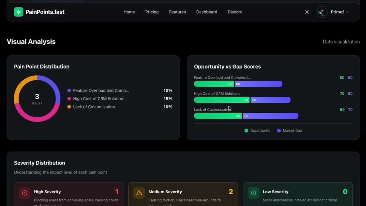 「PainPoints.fast」は、アイデアを入力することで、RedditやX、G2などの会話を分析し、ユーザーの痛点や支払意欲、実際の引用を提供するツールです。これにより、プロダクトの開発が「実行」「検討」「スキップ」のいずれかの判断ができるようになります。