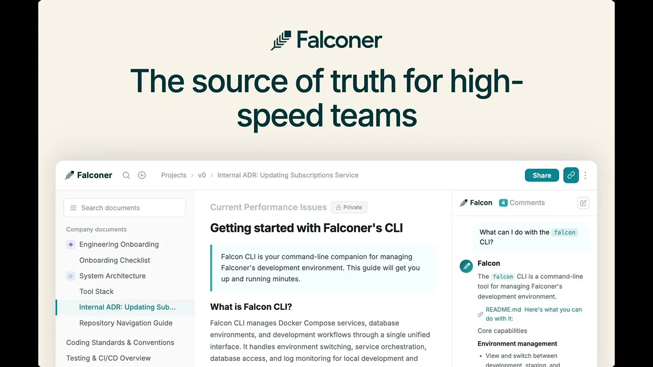 Falconerは、エンジニアリングチームの知識を整理し、リアルタイムで更新される文書を提供するダイナミックな知識プラットフォームです。ユーザーはSlack内で質問を投げかけたり、プルリクエストから文書を生成したりと、情報に迅速にアクセスできる点が評価されています。
