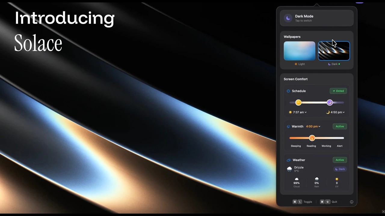 「Solace」は、macOSのダークモードの機能を改善するために作られたアプリで、天候に応じたダークモードの切り替えや、自動で壁紙を変更する機能が特徴です。ユーザーからは、特に天候に敏感な切り替え機能が高く評価されており、従来のオート設定の不便さを解消する点が支持されています。