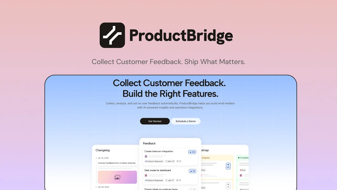 「ProductBridge」は、複数のフィードバックソースから自動的に情報を集約し、AIを用いて整理・分析するプラットフォームです。ユーザーは、フィードバックの収集から実際の機能リリースまでを一元管理でき、特に「ユーザー通知機能」によってフィードバックを提供したユーザーに対して透明性を持たせることが評価されています。