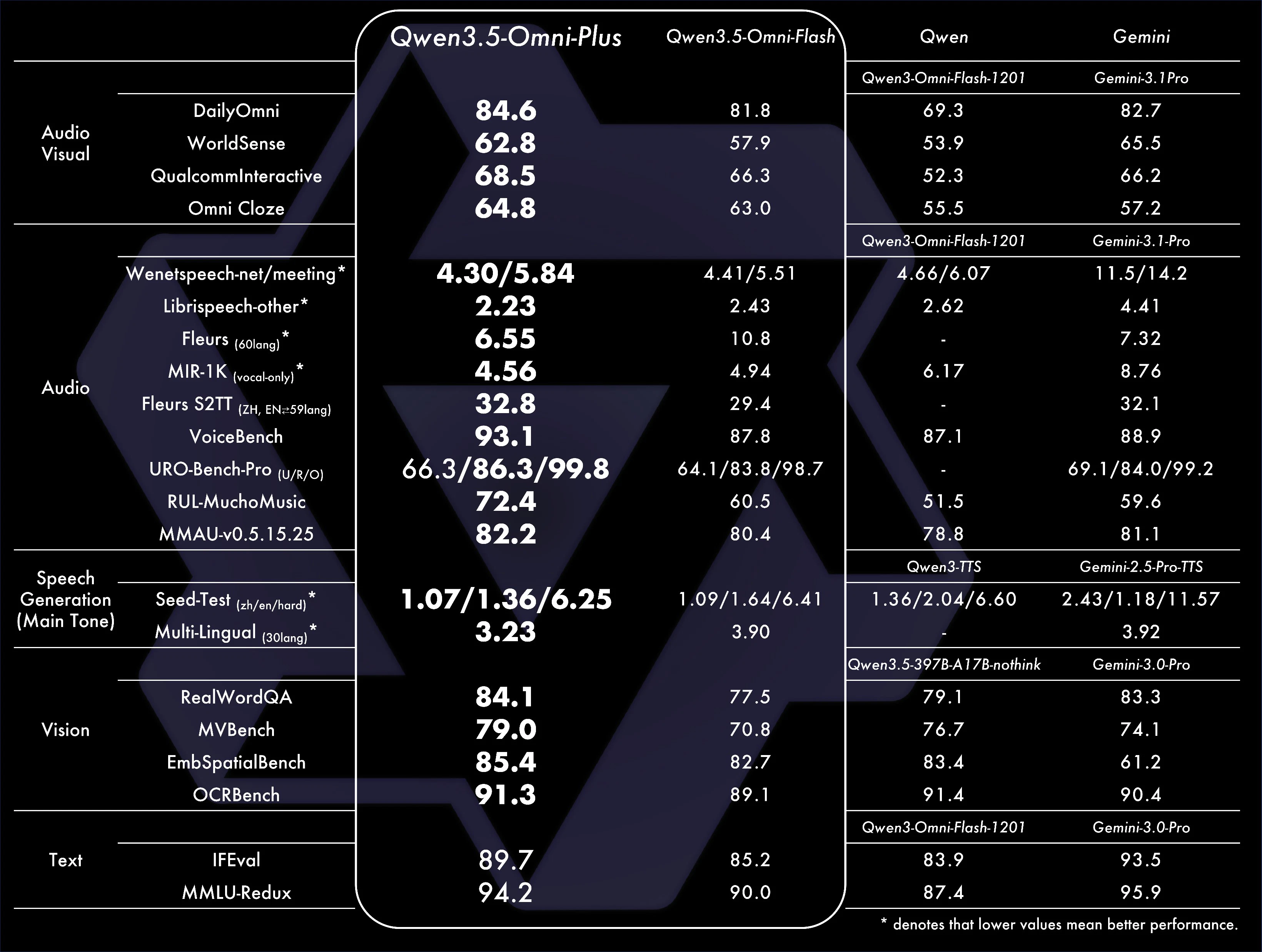 Qwen3.5-Omniは、テキスト、画像、音声、動画を一つのシステムで扱う最新のオムニモデルで、多言語音声に強く、リアルタイムの音声制御やウェブ検索、関数呼び出し、音声クローンなどのインタラクション機能が充実しています。特に音声・動画のキャプショニングや「音響ビジュアル vibe コーディング」に関する機能が注目されています。