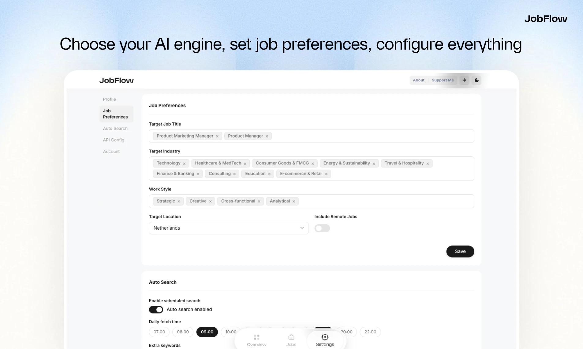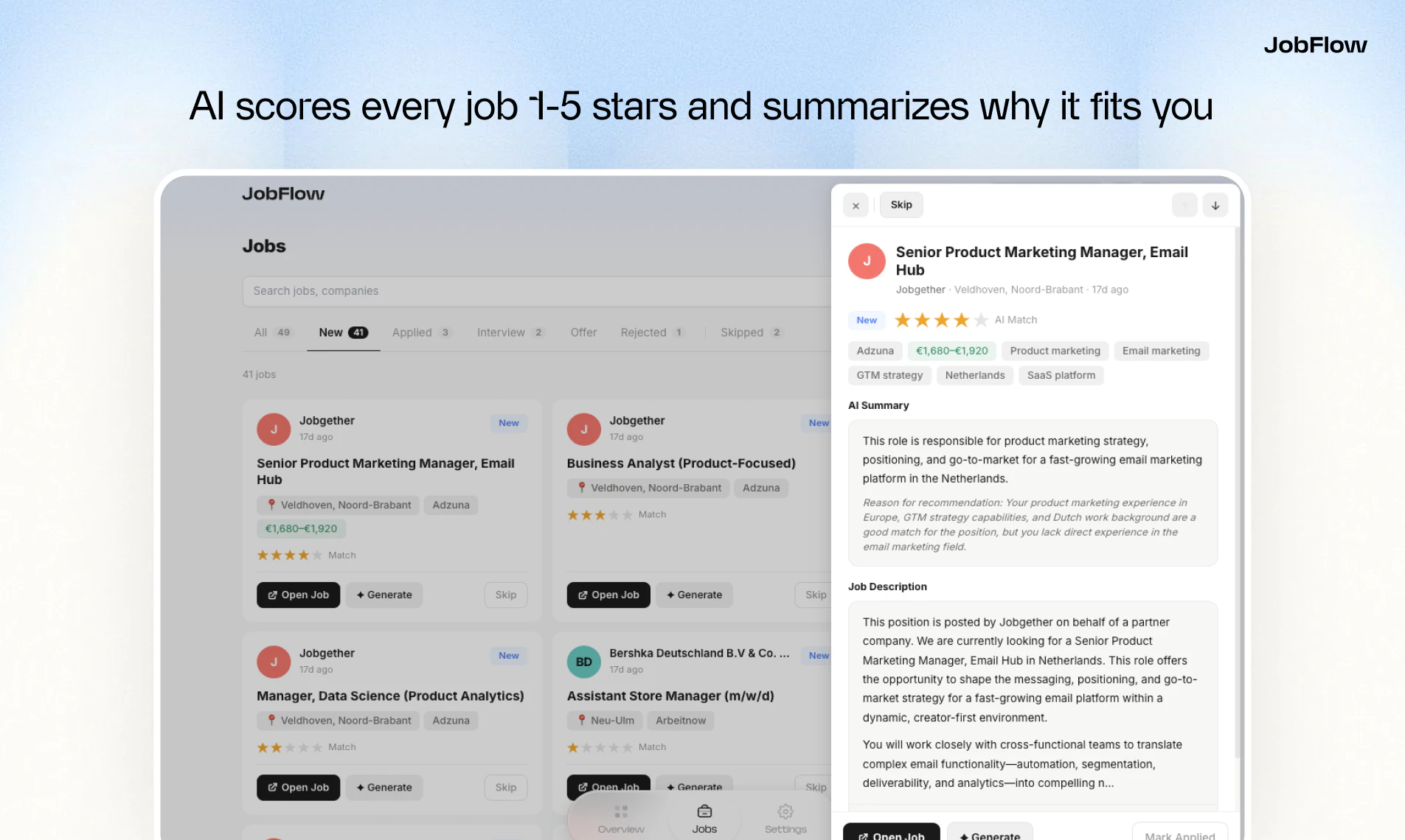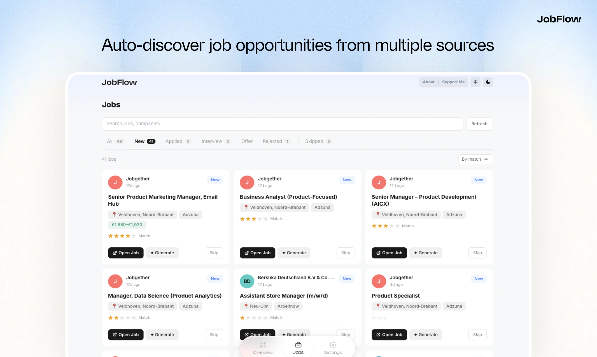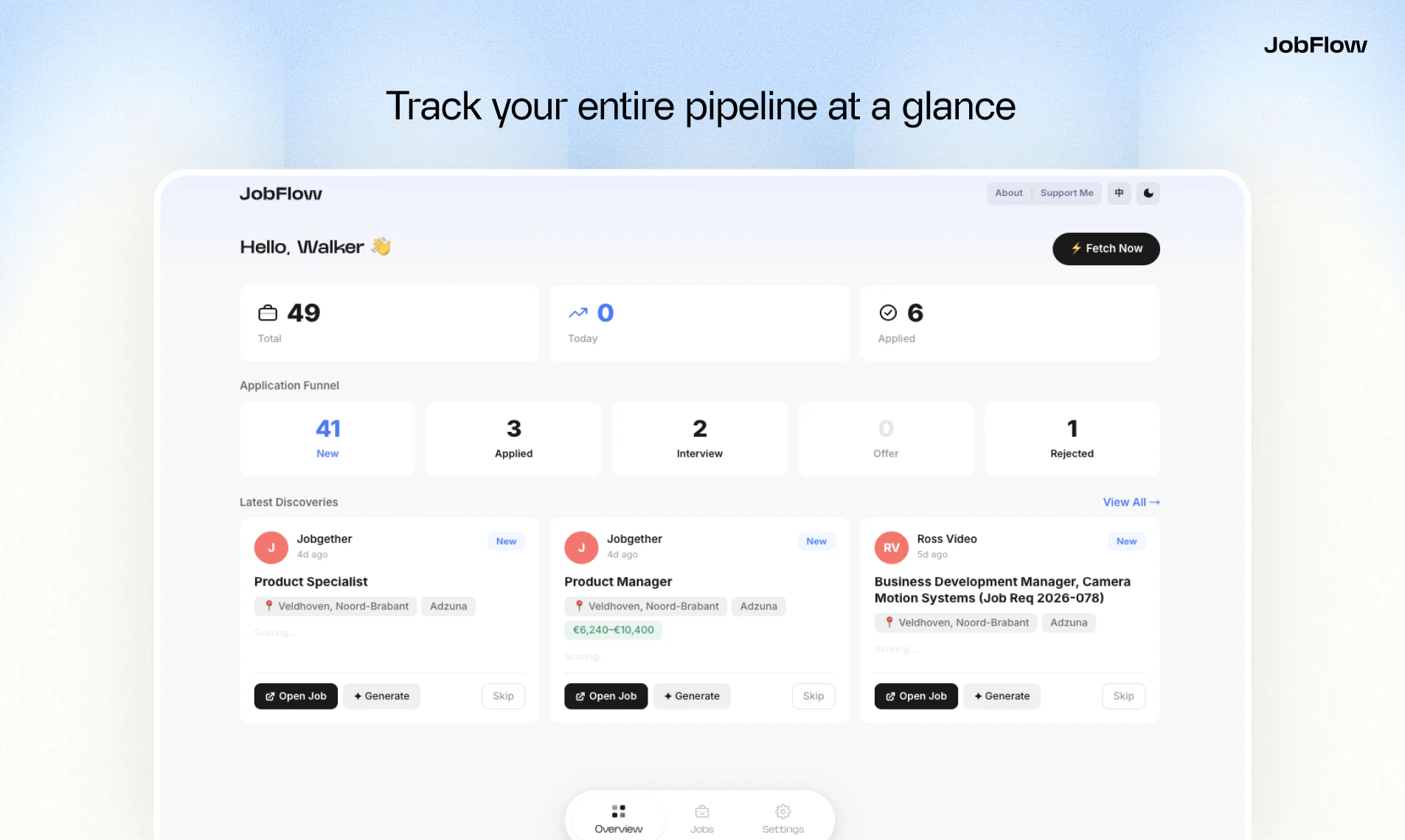 「JobFlow」は、求職者のために面倒な求人検索を支援するAI搭載のツールです。開発者のSenさんは、自身の求職経験から、複数の求人サイトを閲覧したり、カバーレターを毎回書き直したりする煩わしさを軽減するためにこのプロダクトを作りました。現在、オランダ、ドイツ、フランス、ベルギー、スイス、イギリスの6カ国に対応しています。