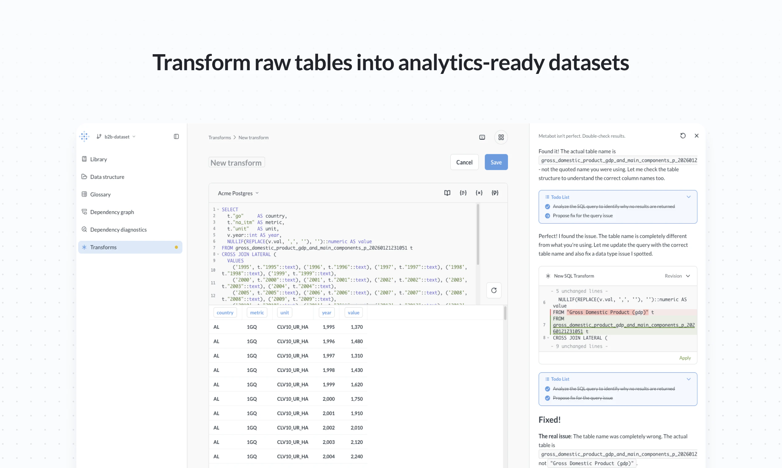 「Metabase Data Studio」は、データの構造を簡単に整理し、信頼性を高めるためのツールセットです。ユーザーは日常的にSQLやPythonを用いてデータ変換を行い、共通の定義を使うことで、チーム内の混乱を解消しています。特に、データフローの依存関係を追跡できる機能が好評で、ダッシュボードの不具合を早期に発見する手助けをしています。