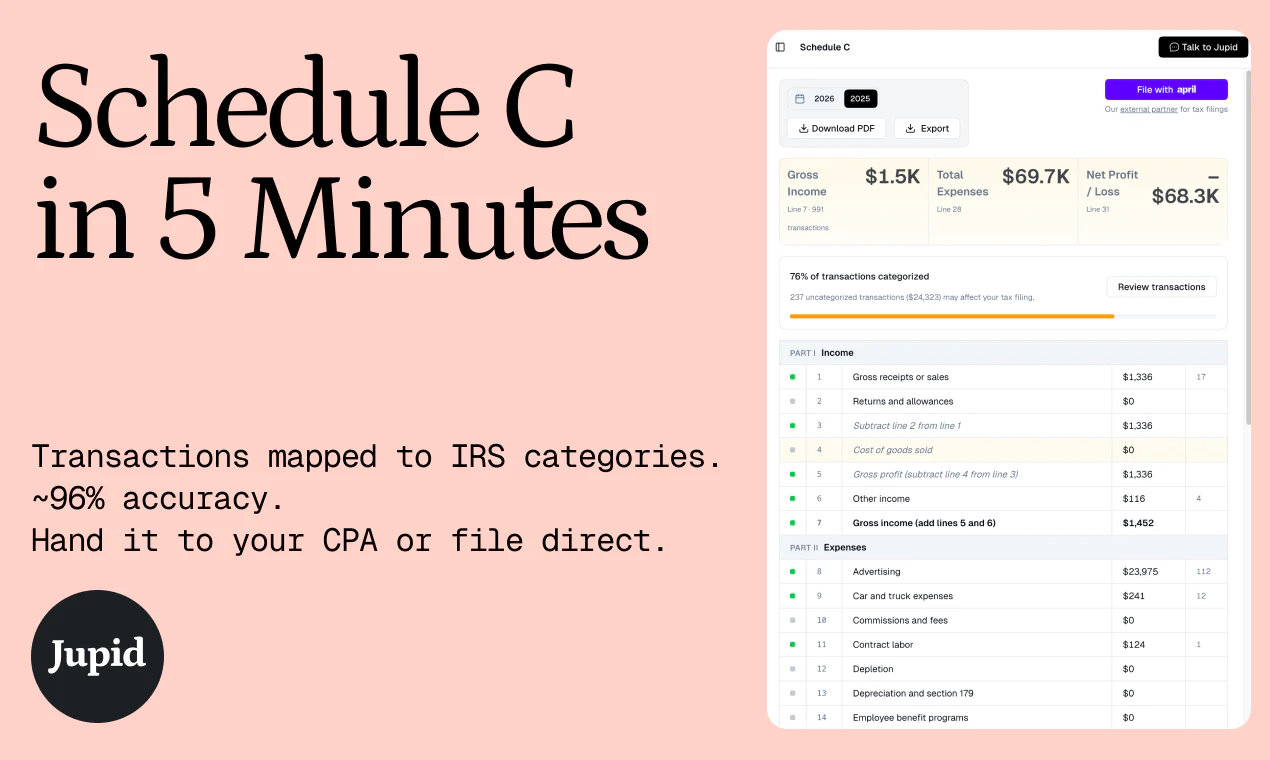 「Jupid」は、銀行とリアルタイムで接続し、ユーザーのビジネスやベンダーを学習して自動で取引を分類し、税務書類を迅速に作成できる会計ツールです。