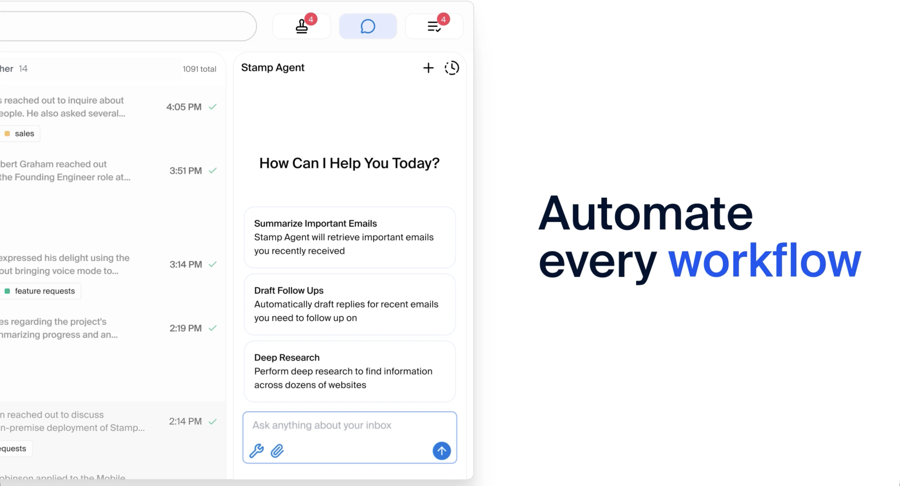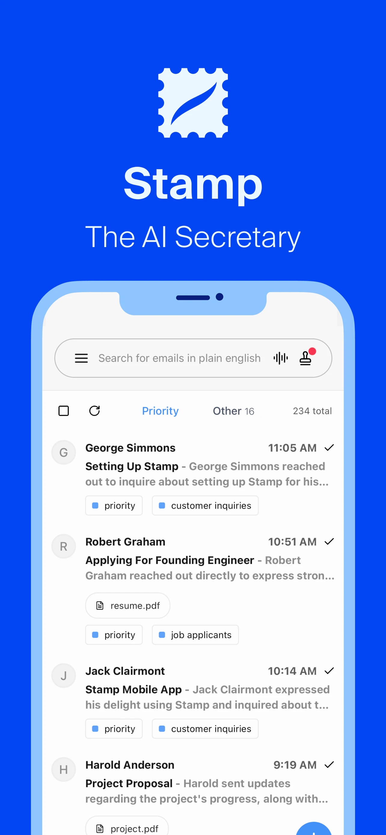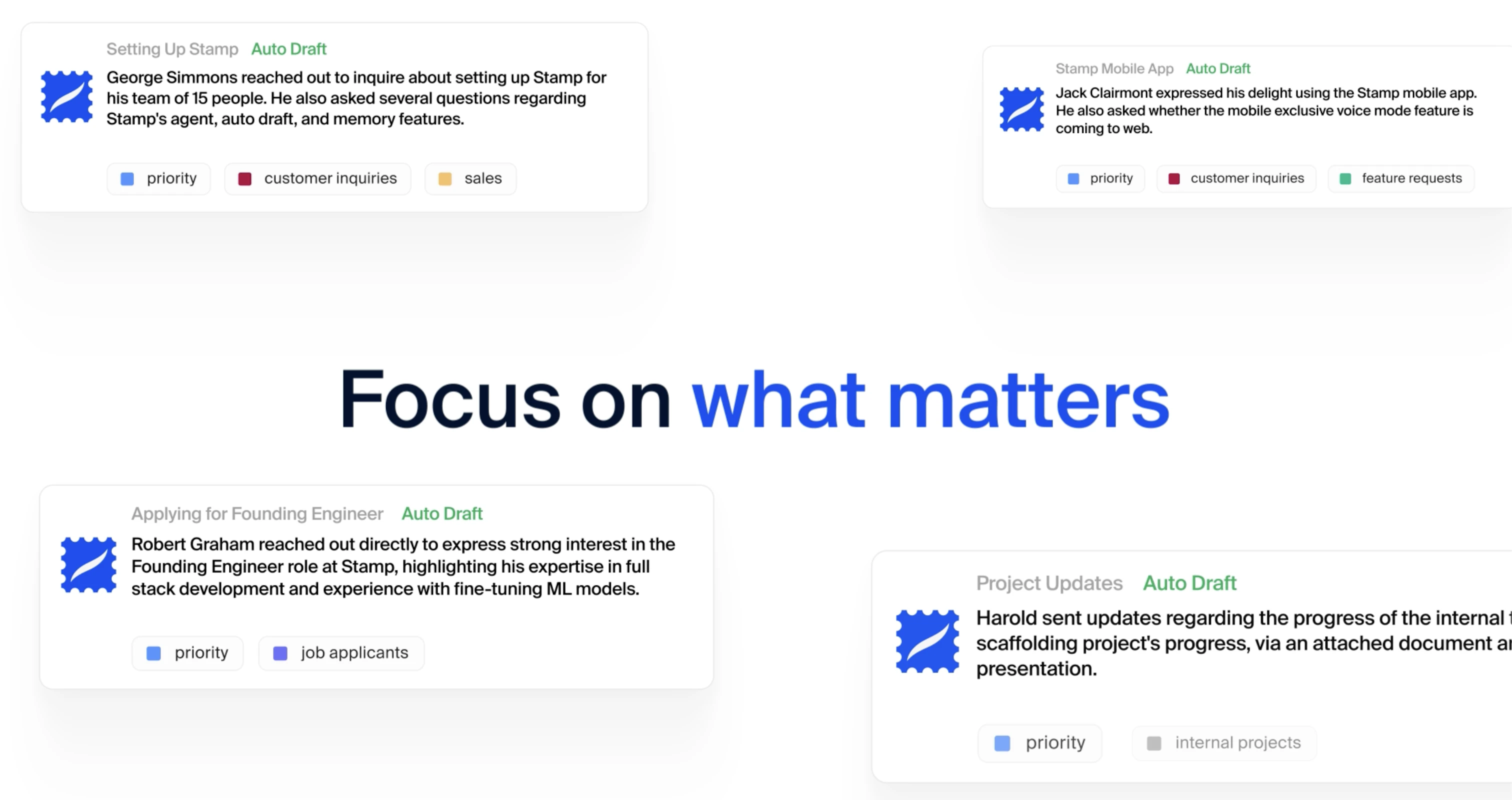 Stampは、メールやカレンダーを管理するAI秘書で、ユーザーのために優先順位を付け、要約し、タスクを抽出して返信を下書きする機能を備えています。ユーザーの好みやスタイルを学習する「メモリー」機能や、ワークフローを自動化する「エージェント」機能、音声で操作できる「ボイスモード」など、多様な機能が魅力です。